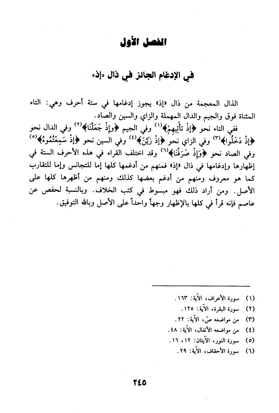 ففي التاء نحو {إِذْ تَأْتِيهِمْ} [الأعراف: 163] وفي الجيم {وَإِذْ جَعَلْنَا} [البقرة: 125] وفي الدال نحو {إِذْ دَخَلُواْ} [ص: 22] وفي الزاي نحو {إِذْ زَيَّنَ} [الأنفال: 48] وفي السين نحو {إِذْ سَمِعْتُمُوهُ} [النور: 12-16] وفي الصاد نحو {وَإِذْ صَرَفْنَآ} [الأحقاف: 29] وقد اختلف القراء في هذه الأحرف الستة في إظهارها وإدغامها في ذال "إذ" فمنهم من أدغمها كلها إما للتجانس وإما للتقارب كما هو معروف ومنه من أدغم بعضها كذلك ومنهم من أظهرها كلها على الأصل. ومن أراد ذلك فهو مبسوط في كتب الخلاف. وبالنسبة لحفص عن عاصم فإنه قرأ في كلها بالإظهار وجهاً واحداً على الأصل وبالله التوفيق.