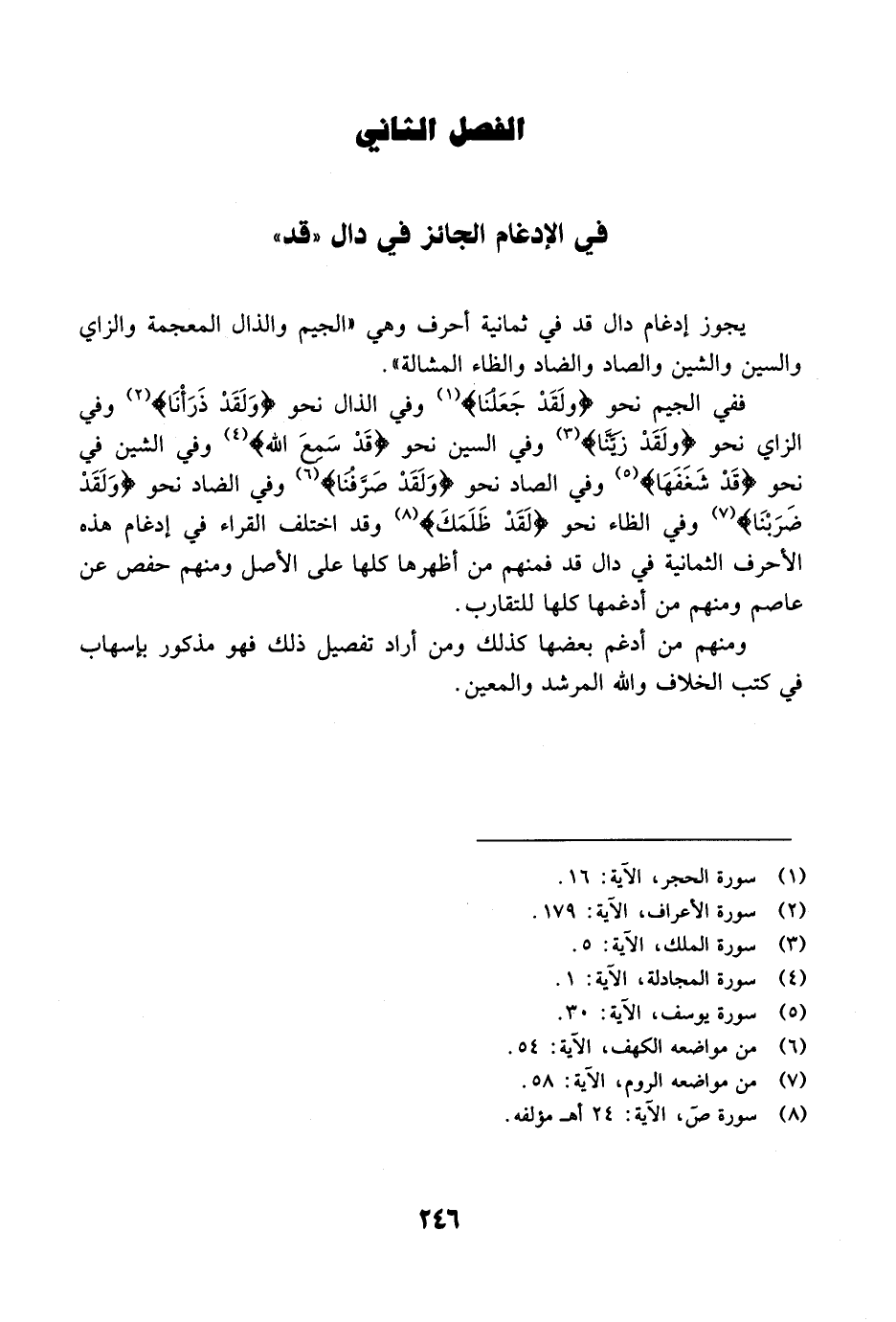 ففي الجيم نحو {وَلَقَدْ جَعَلْنَا} [الحجر: 16] وفي الذال نحو {وَلَقَدْ ذَرَأْنَا} [الأعراف: 179] وفي الزاي نحو {وَلَقَدْ زَيَّنَّا} [الملك: 5] وفي السين نحو {قَدْ سَمِعَ الله} [المجادلة: 1] وفي الشين في نحو {قَدْ شَغَفَهَا} [يوسف: 30] وفي الصاد نحو {وَلَقَدْ صَرَّفْنَا} [الكهف: 54] وفي الضاد نحو {وَلَقَدْ ضَرَبْنَا} [الروم: 58] وفي الظاء نحو {لَقَدْ ظَلَمَكَ} [ص: 24] وقد اختلف القراء في إدغام هذه الأحرف الثمانية في دال قد فمنهم من أظهرها كلها على الأصل ومنهم حفص عن عاصم ومنهم أدغمها كلها للتقارب.