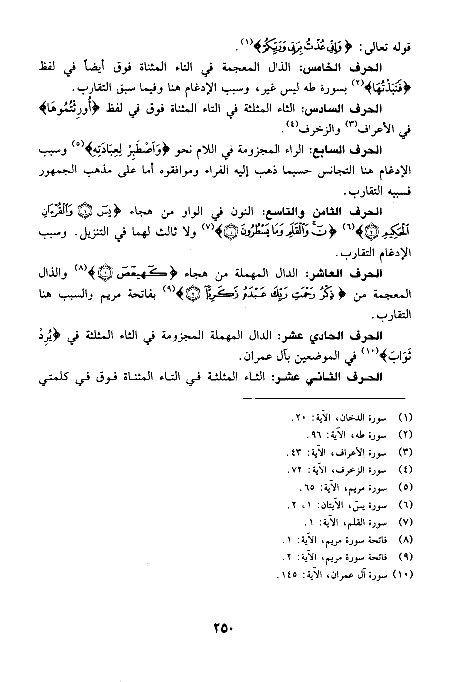 الحرف العاشر: الدال المهملة من هجاء {كهيعص} [مريم: 1] والذال المعجمة من {ذِكْرُ رَحْمَةِ رَبِّكَ عَبْدَهُ زَكَرِيَّآ} [مريم: 2] بفاتحة مريم والسبب هنا التقارب.
