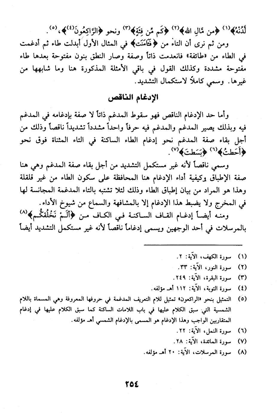 ومنه أيضاً إدغام القاف الساكنة في الكاف من {أَلَمْ نَخْلُقكُّم} [المرسلات: 20] بالمرسلات في أحد الوجهين ويسمى إدغاماً ناقصاً لأنه غير مستكمل التشديد أيضاً