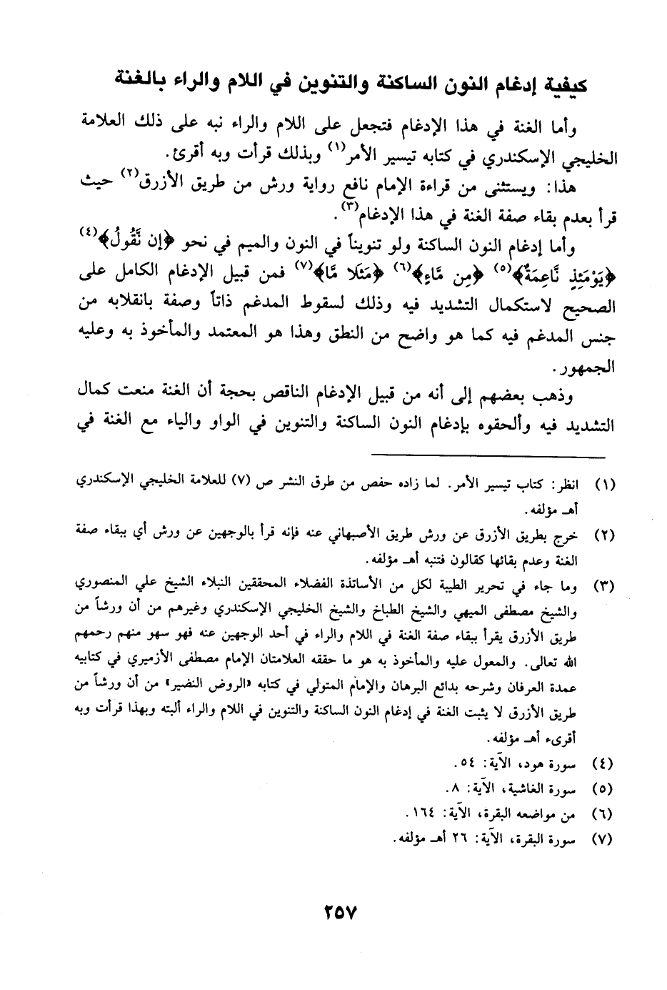 وأما إدغام النون الساكنة ولو تنويناً في النون والميم في نحو {إِن نَّقُولُ} [هود: 54] {يَوْمَئِذٍ نَّاعِمَةٌ} [الغاشية: 8] {مِن مَّآءٍ} [البقرة: 164] {مَثَلاً مَّا} [البقرة: 26] فمن قبيل الإدغام الكامل على الصحيح لاستكمال التشديد فيه وذلك لسقوط المدغم ذاتاً وصفة بانقلابه من جنس المدغم فيه كما هو واضح من النطق وهذا هو المعتمد والمأخوذ به وعليه الجمهور.