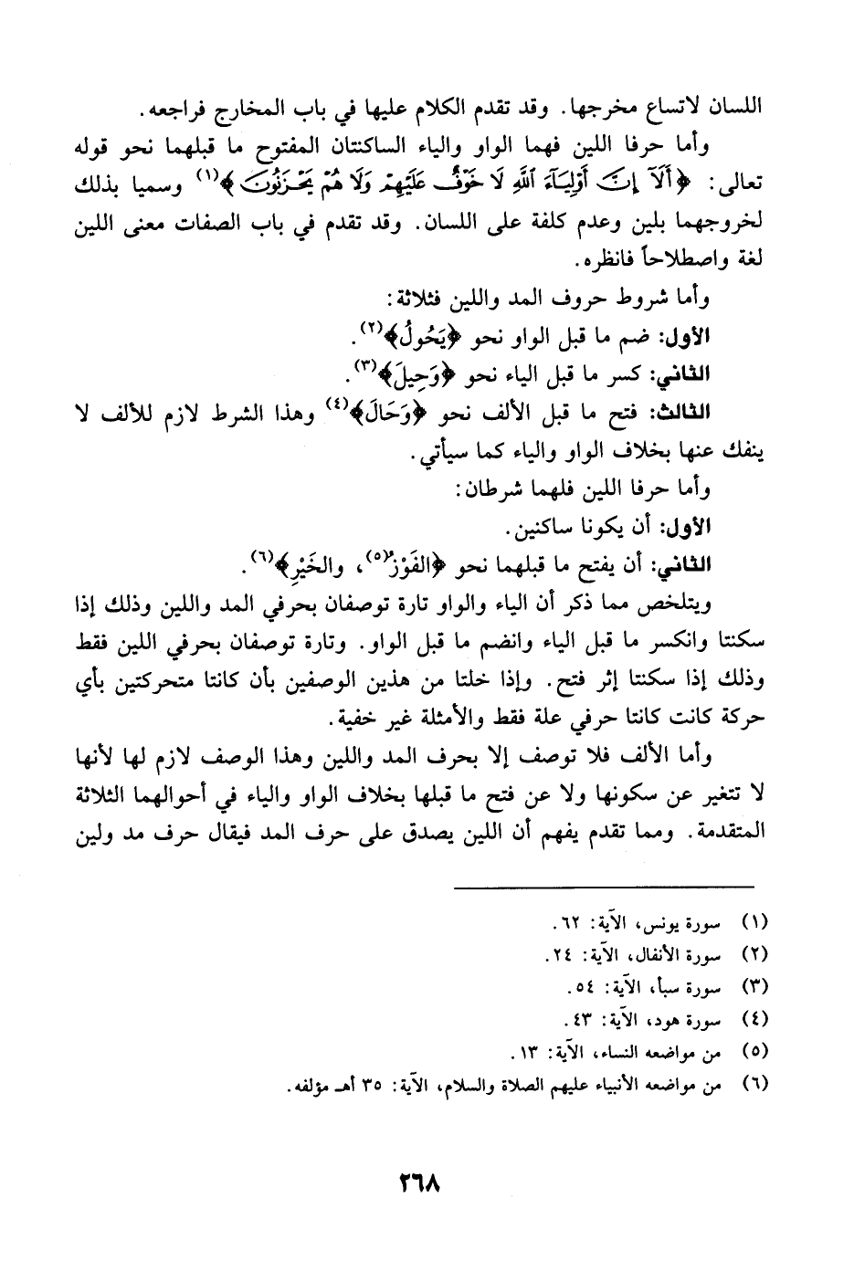 وأما حرفا اللين فهما الواو والياء الساكنتان المفتوح ما قبلهما نحو قوله تعالى: {ألا إِنَّ أَوْلِيَآءَ الله لاَ خَوْفٌ عَلَيْهِمْ وَلاَ هُمْ يَحْزَنُونَ} [يونس: 62] وسميا بذلك لخروجهما بلين وعدم كلفة على اللسان. وقد تقدم في باب الصفات معنى اللين لغة واصطلاحاً فانظره.