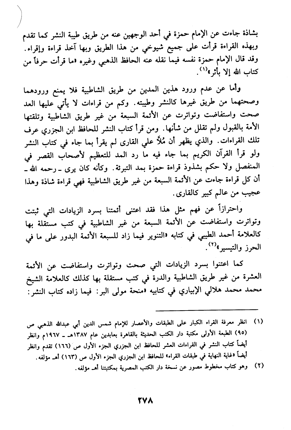 وأما عن عدم ورود هذين المدين من طريق الشاطبية فلا يمنع ورودهما وصحتهما من طريق غيرها كالنشر وطيبته. وكم من قراءات لا يأتي عليها العد صحت واستفاضت وتواترت عن الأئمة السبعة من غير طريق الشاطبية وتلقتها الأمة بالقبول ولم تقلل من شأنها. ومن قرأ كتاب النشر للحافظ ابن الجزري عرف تلك القراءات. والذي يظهر أن مُلاَّ علي القارى لم يقرأ بما جاء في كتاب النشر ولو قرأ القرآن الكريم بما جاء فيه ما رد المد للتعظيم لأصحاب القصر في المنفصل ولا حكم بشذوذ قراءة حمزة بمد التبرئة. وكأنه كان يرى - رحمه الله - أن كل قراءة جاءت عن الأئمة السبعة من غير طريق الشاطبية فهي قراءة شاذة وهذا عجيب من عالم كبير كالقارى.