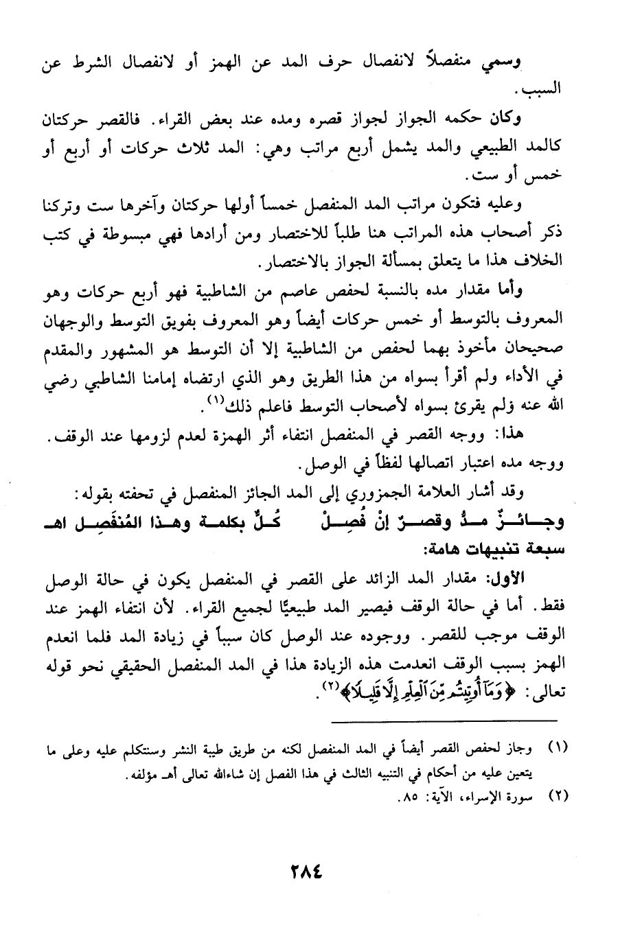 وعليه فتكون مراتب المد المنفصل خمساً أولها حركتان وآخرها ست وتركنا ذكر أصحاب هذه المراتب هنا طلباً للاختصار ومن أرادها فهي مبسوطة في كتب الخلاف هذا ما يتعلق بمسألة الجواز بالاختصار.