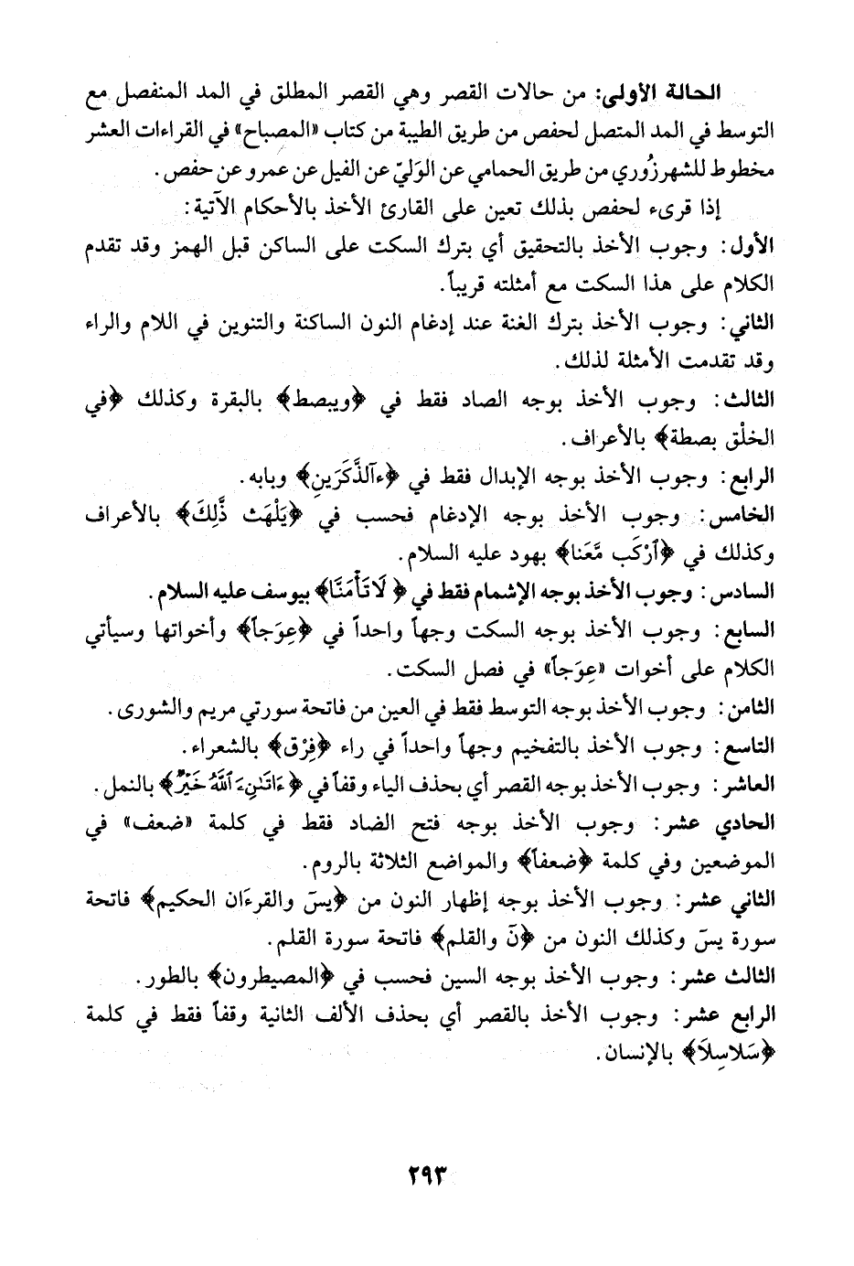 الحادي عشر: وجوب الأخذ بوجه فتح الضاد فقط في كلمة "ضعف" في الموضعين وفي كلمة {ضَعْفاً} [الروم: 54] والمواضع الثلاث بالروم.