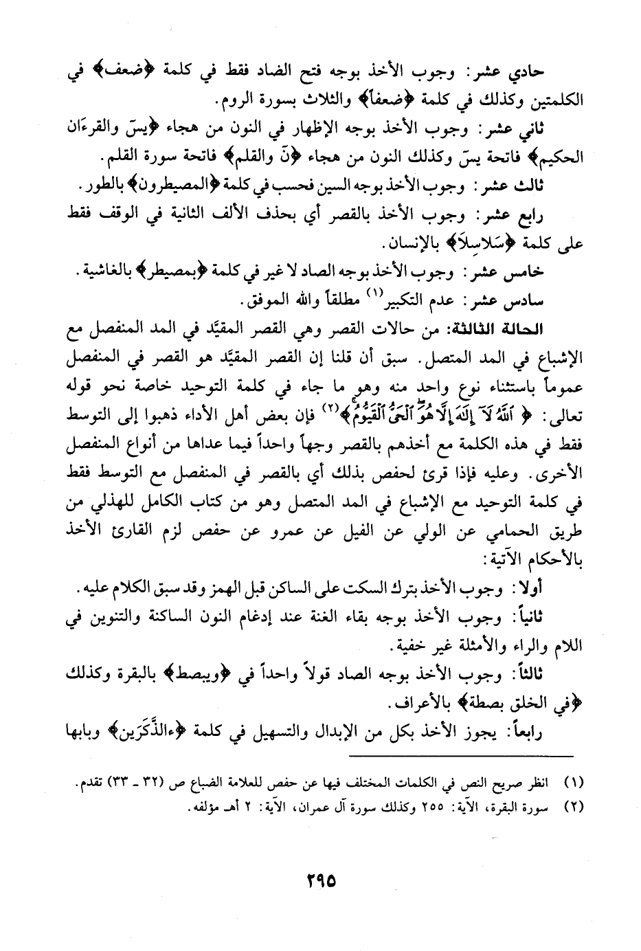 ثاني عشر: وجوب الأخذ بوجه الفتح في الضاد لا غير في كلمة {ضعف} [الآية: 54] في الموضعين وكذلك في كلمة {ضَعْفاً} [الآية: 54] والمواضع الثلاثة في سورة الروم.