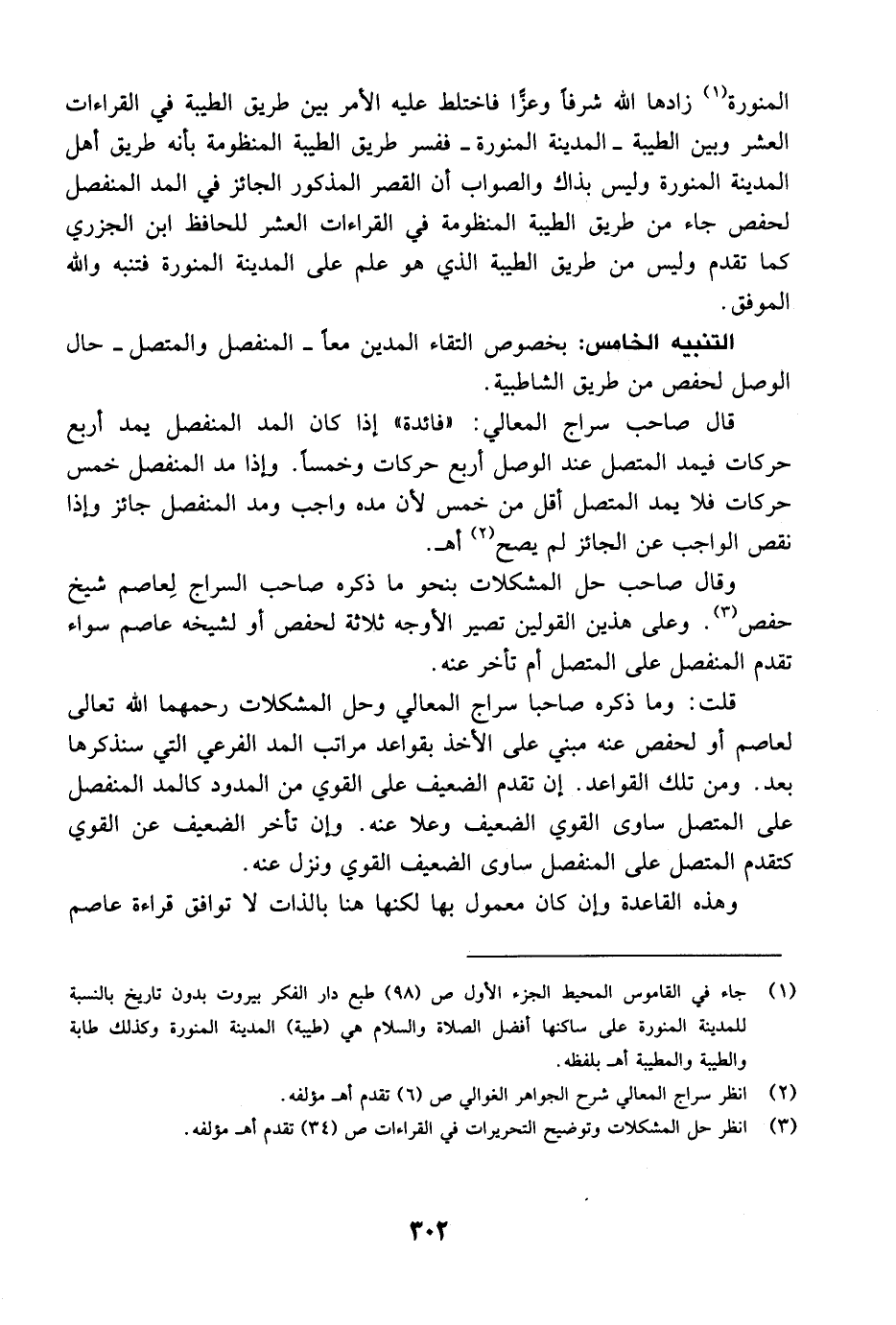 المنورة زادها الله شرفاً وعزّاً فاختلط عليه الأمر بين طريق الطيبة في القراءات العشر وبين الطيبة - المدينة المنورة - ففسر الطيبة المنظومة بأنه طريق أهل المدينة المنورة وليس بذاك والصواب أن القصر المذكور الجائز في المد المنفصل لحفص جاء من طريق الطيبة المنظومة في القراءات العشر للحافظ ابن الجزري كما تقدم وليس من طريق الطيبة الذي هو علم على المدينة المنورة فتنبه والله الموفق.