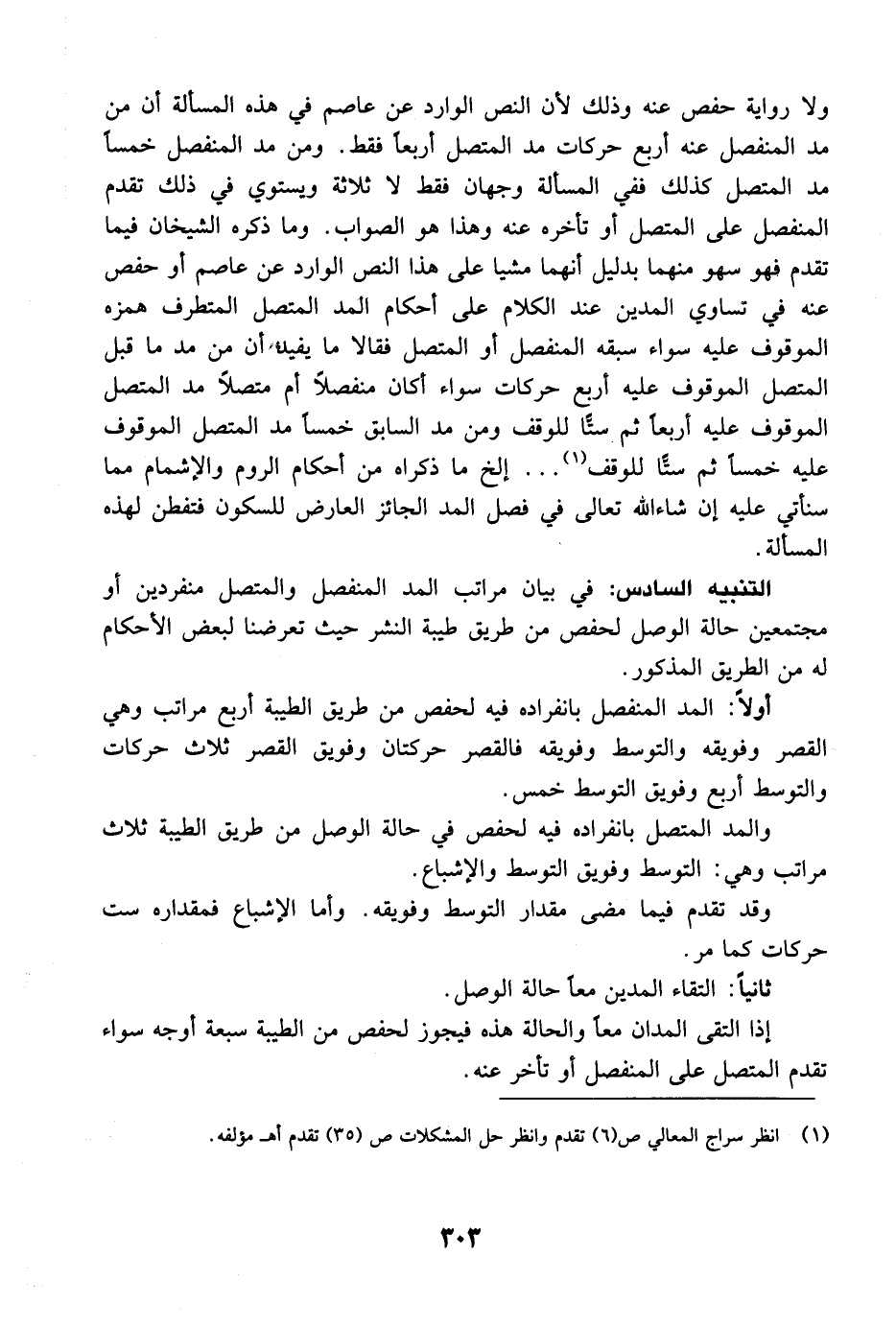التنبيه السادس: في بيان مراتب المد المنفصل والمتصل منفردين أو مجتمعين حالة الوصل لحفص من طريق طيبة النشر حيث تعرضنا لبعض الأحكام له من الطريق المذكور.