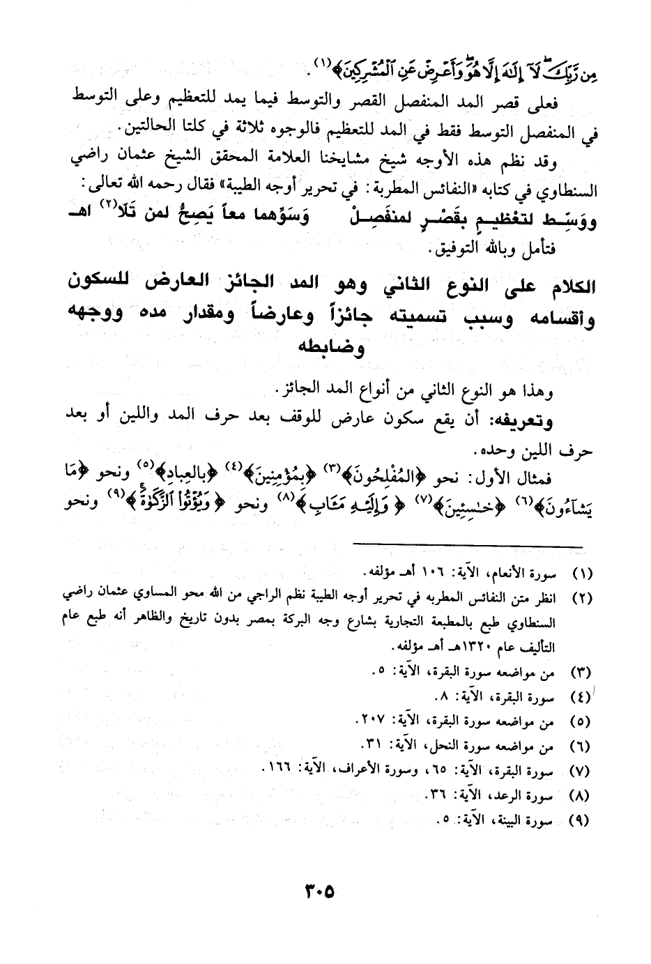 ومثال الثاني: نحو {السير} [سبأ 18] {مِّنْ خَوْفٍ} [قريش: 4] {مَثَلُ السوء} [النحل: 60] {لَّسْتَ مِنْهُمْ فِي شَيْءٍ} [الأنعام: 159] .