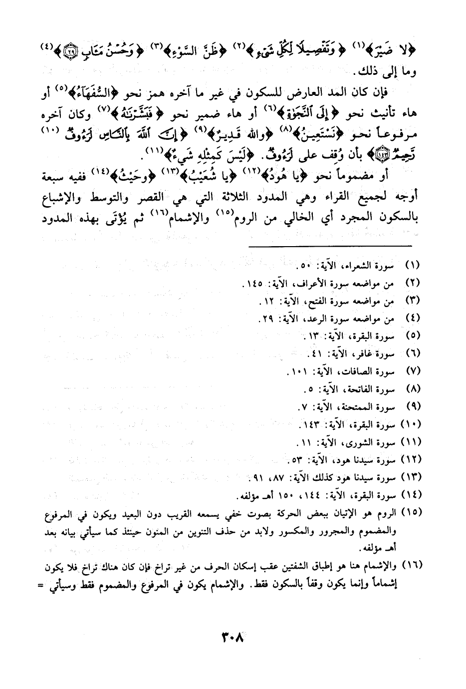 الثلاثة مرة أخرى بالسكون مع الإشمام. ثم الروم ولا يكون إلا مع القصر. وذلك لأن الروم مثل الوصل. وأصل المد العارض في حالة الوصل كان طبيعيّاً ومده حركتان. ولهذا كان الوقف بالروم كالوصل أي على مد حركتين.