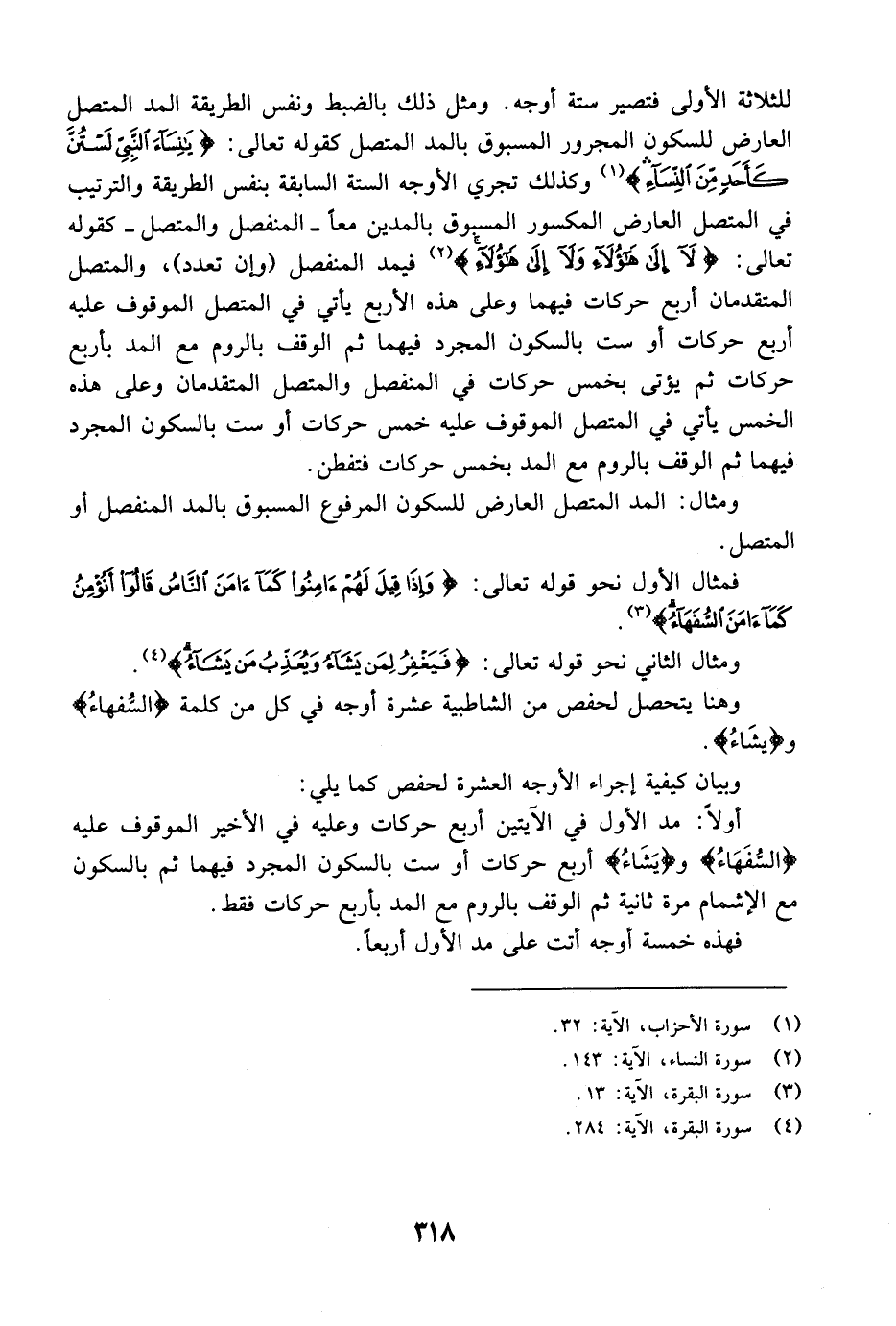 أولاً: يمد المنفصل والمتصل المتقدمان معاً أربع حركات ويؤتى في الأخير الموقوف بأربع حركات أو ست بالسكون المجرد فيهما ثم بالسكون مع الإشمام مرة ثانية ثم الوقف بالروم مع المد بأربع حركات فقط فهذه خمسة أوجه أتت على مد الأولين أربعاً.