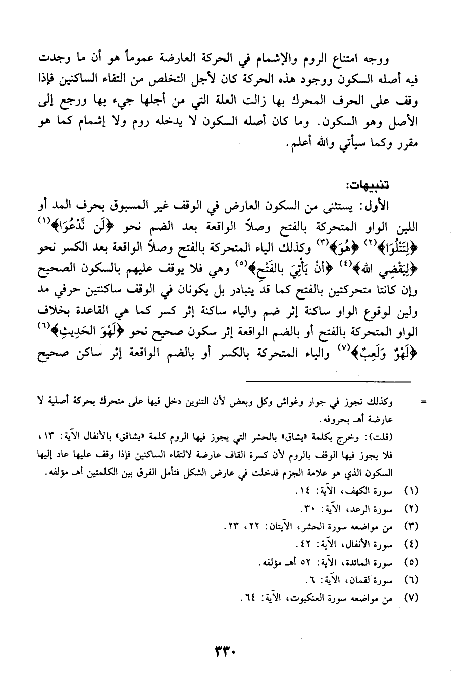 التنبيه الثاني: يحذف التنوين من المنون في حالة الوقف بالروم كحذفه حالة الوقف بالسكون سواء أكان الحرف الموقوف عليه تقدمه حرف مد ولين أو حرف لين أم لم يتقدمه نحو {مِن سواء} [يوسف: 51] {والله قَدِيرٌ} [الممتحنة: 7] {لَيْسَ كَمِثْلِهِ شَيْءٌ} [الشورى: 11] {وَآمَنَهُم مِّنْ خَوْفٍ} [قريش: 4] {دِفْءٌ} [النحل: 5] {مِنْ حَقٍّ} [هود: 79] {على بَعْضٍ} [البقرة: 253] وما إلى ذلك.