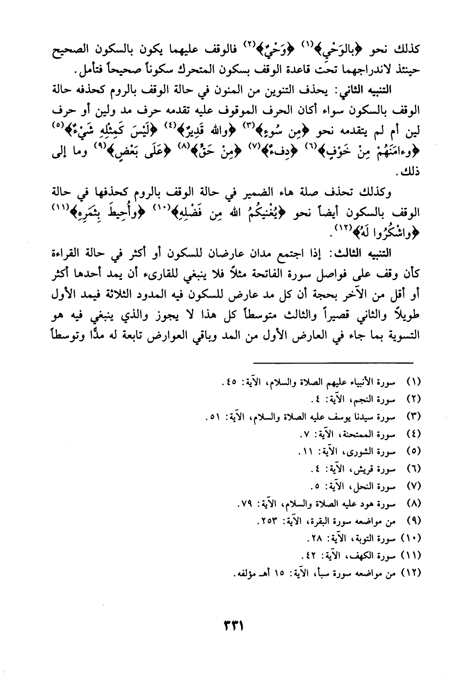 التنبيه الرابع: علم مما تقدم أن المد الجائز العارض للسكون مطلقاً سواء كان ممدوداً بحرف المد واللين أو بحرف اللين فقط نحو {الحمد للَّهِ رَبِّ العالمين} [الفاتحة: 2] {ذَلِكَ الكتاب لاَ رَيْبَ} [البقرة: 2] يجوز فيه المدود الثلاثة التي هي القصر والتوسط والإشباع وهذه المدود الثلاثة تجري في كل من النوعين - أي العارض الممدود بحرف المد واللين أو العارض الممدود بحرف اللين على انفراد.