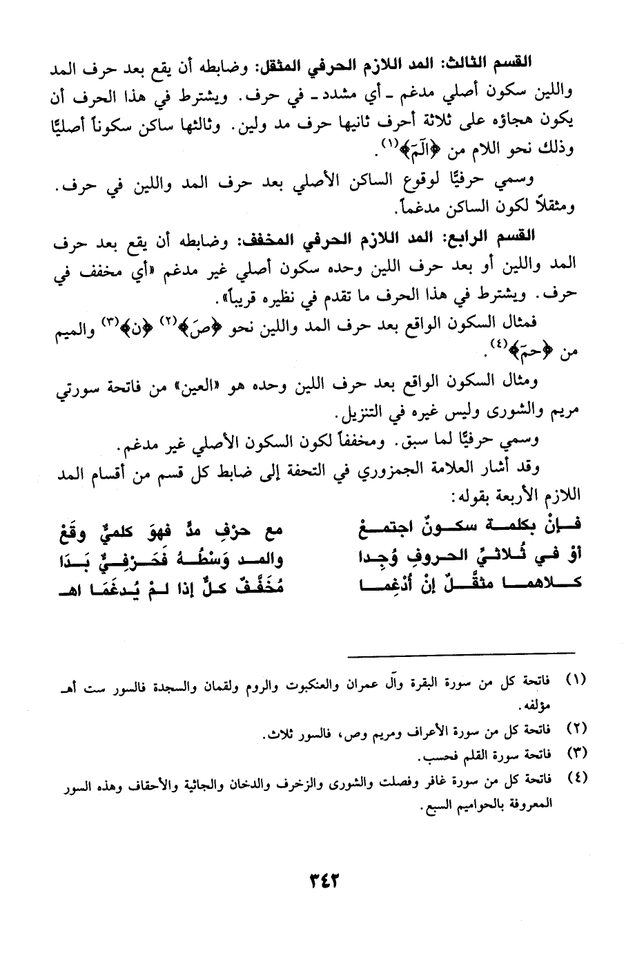 القسم الرابع: المد اللازم الحرفي المخفف: وضابطه أن يقع بعد حرف المد واللين أو بعد حرف اللين وحده سكون أصلي غير مدغم "أي مخفف في حرف. ويشترط في هذا الحرف ما تقدم في نظيره قريباً".