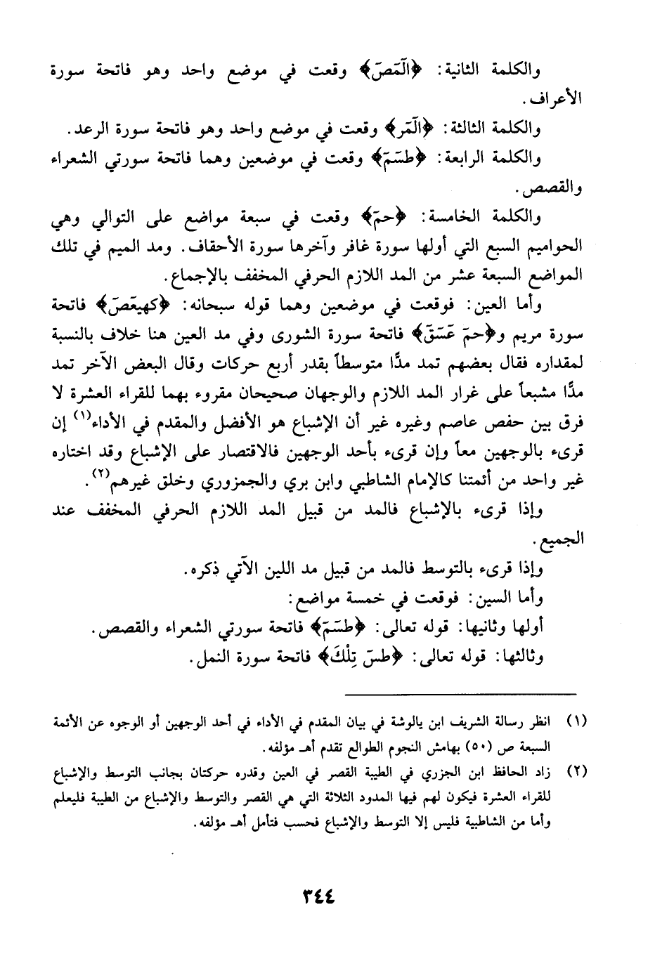 وأما اللام فوقعت في أربع كلمات في ثلاثة عشر موضعاً. أما الكلمات الأربع: فهي {الم. المص. المر. الر} .