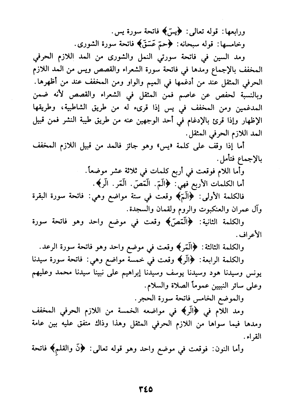 ومد اللام في {الر} في مواضعه الخمسة من اللازم الحرفي المخفف ومدها فيما سواها من اللازم الحرفي المثقل وهذا وذاك متفق عليه بين عامة القراء.