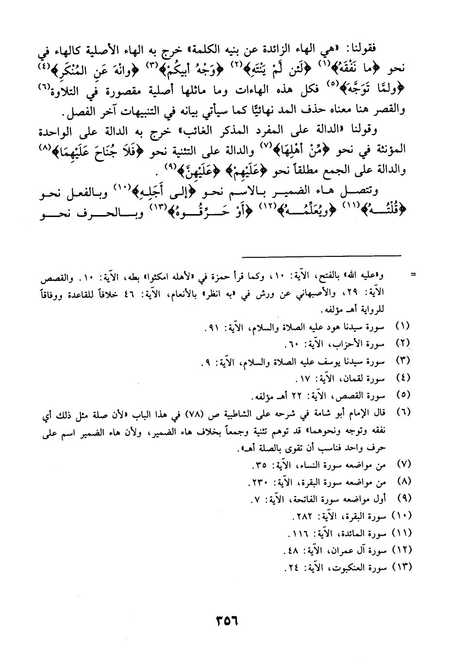 فقولنا: "هي الهاء الزائدة عن بنيه الكلمة" خرج به الهاء الأصلية كالهاء في نحوة {مَا نَفْقَهُ} [هود: 91] {لَّئِن لَّمْ يَنتَهِ} [الأحزاب: 60] {وَجْهُ أَبِيكُمْ} [يوسف: 9] {وانه عَنِ المنكر} [لقمان: 17] {وَلَمَّا تَوَجَّهَ} [القصص: 22] فكل هذه الهاءات وما مائلها أصلية مقصورة في التلاوة والقصر هنا معناه حذف المد نهائيّاً كما سيأتي بيانه في التنبيهات آخر الفصل.