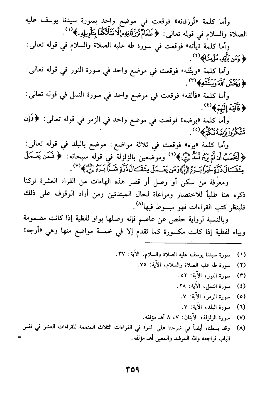 وأما كلمة "يره" فوقعت في ثلاثة مواضع: موضع بالبلد في قوله تعالى: {أَيَحْسَبُ أَن لَّمْ يَرَهُ أَحَدٌ} [البلد: 7] وموضعين بالزلزلة في قوله سبحانه: {فَمَن يَعْمَلْ مِثْقَالَ ذَرَّةٍ خَيْراً يَرَهُ وَمَن يَعْمَلْ مِثْقَالَ ذَرَّةٍ شَرّاً يَرَهُ} [الزلزلة: 7-8] .