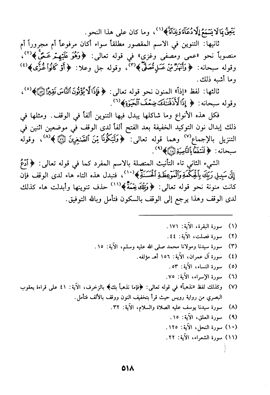فكل هذه الأنواع وما شاكلها يبدل فيها التنوين ألفاً في الوقف. ومثلها في ذلك إبدال نون التوكيد الخفيفة بعد الفتح ألفاً لدى الوقف في موضعين اثنين في التنزيل بالإجماع وهما قوله تعالى: {وَلَيَكُوناً مِّن الصاغرين} [يوسف: 32] ، وقوله سبحانه: {لَنَسْفَعاً بالناصية} [العلق: 15] .