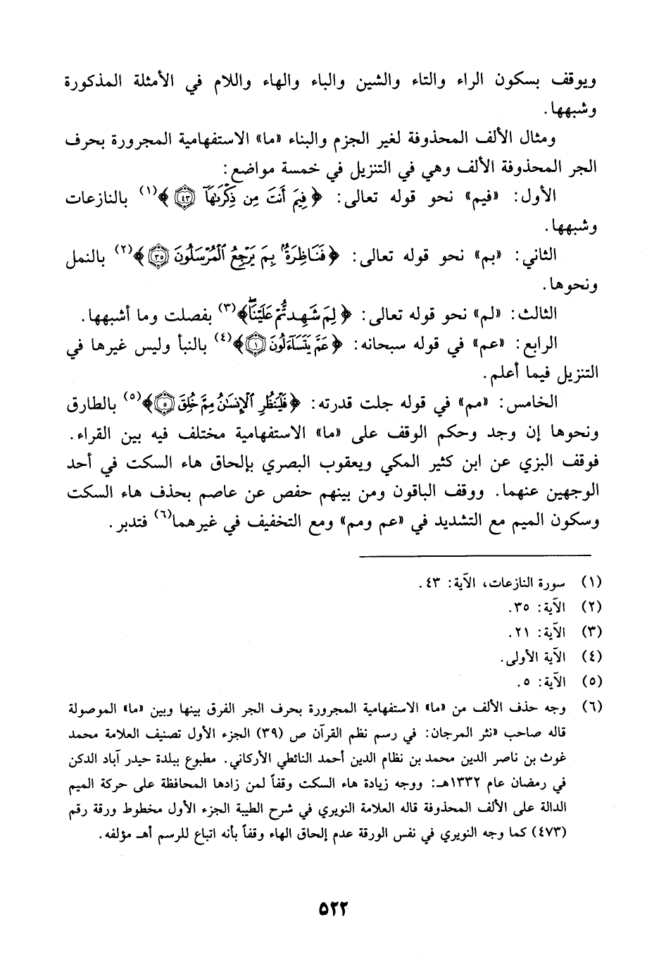 الخامس: "مم" في قوله جلت قدرته: {فَلْيَنظُرِ الإنسان مِمَّ خُلِقَ} [الآية: 5] بالطارق ونحوها إن وجد وحكم الوقف على "ما" الاستفهامية مختلف فيه بين القراء. فوقف البزي عن ابن كثير المكي ويعقوب البصري بإلحاق هاء السكت في أحد الوجهين عنهما. ووقف الباقون ومن بينهم حفص عن عاصم بحذف هاء السكت وسكون الميم مع التشديد في "عم ومم" ومع التخفيف في غيرهما فتدبر.