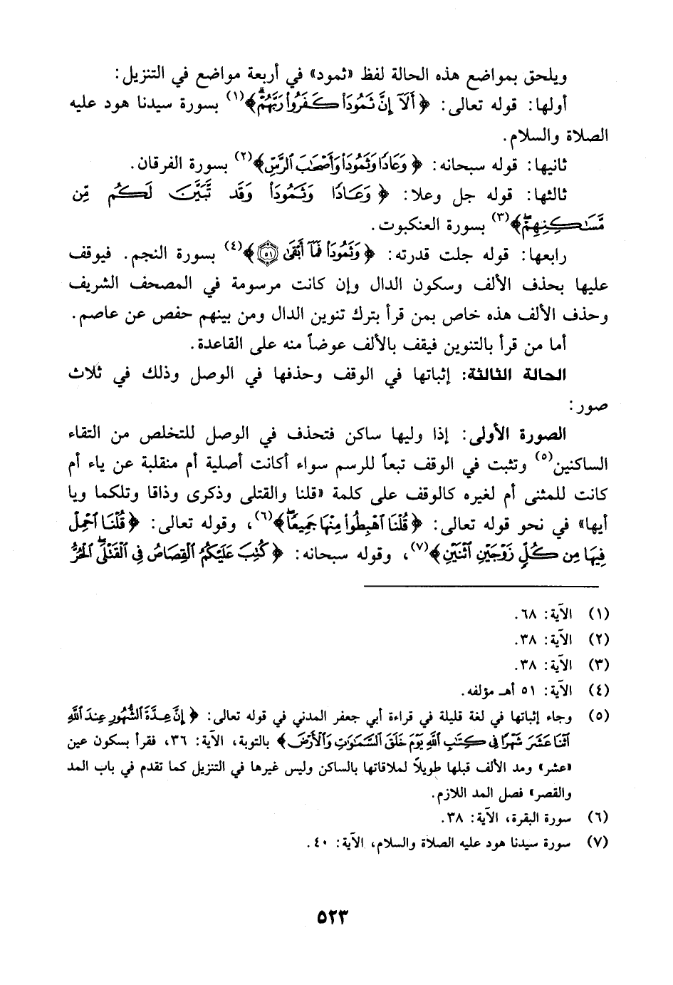 رابعها: قوله جلت قدرته: {وَثَمُودَ فَمَآ أبقى} [الآية: 51] بسورة النجم. فيوقف عليها بحذف الألف وسكون الدال وإن كانت مرسومة في المصحف الشريف وحذف الألف هذه خاص بمن قرأ بترك تنوين الدال ومن بينهم حفص عن عاصم.