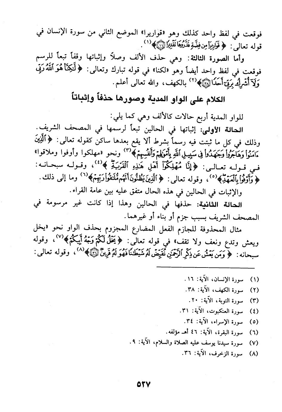 أما مثال ما حذفت منه الواو لغير الجزم والبناء فهو في أربعة أفعال باتفاق المصاحف والقراء وهي "يدع ويمحو وسندع" في قوله تعالى: {يَوْمَ يَدْعُ الداع} [الآية: 6] بالقمر، وقوله سبحانه: {وَيَدْعُ الإنسان بالشر دُعَآءَهُ بالخير} [الآية: 11] بالإسراء، وقوله تعالى: {وَيَمْحُ الله الباطل وَيُحِقُّ الحق بِكَلِمَاتِهِ} [الآية: 24] بالشورى، وقوله جل شأنه: {سَنَدْعُ الزبانية} [الآية: 18] بالعلق.