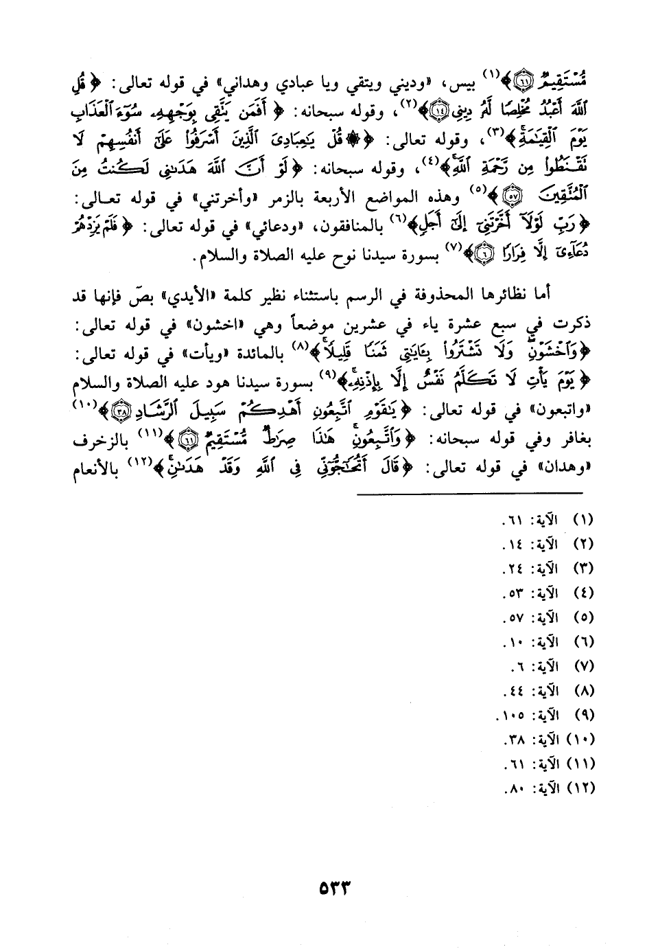 والمهتد" في قوله تعالى: {وَمَن يَهْدِ الله فَهُوَ المهتد} [الآية: 97] بالإسراء، وفي قوله سبحانه: {مَن يَهْدِ الله فَهُوَ المهتد} [الآية: 17] بالكهف "وكيدون" في قوله سبحانه: {ثُمَّ كِيدُونِ فَلاَ تُنظِرُونِ} [الآية: 195] بالأعراف، "ونبغ" في قوله تعالى: {قَالَ ذَلِكَ مَا كُنَّا نَبْغِ} [الآية: 64] بالكهف "واتبعن" في قوله تعالى: {فَقُلْ أَسْلَمْتُ وَجْهِيَ للَّهِ وَمَنِ اتبعن} [الآية: 20] بآل عمران، "وتسألن" في قوله تعالى: {فَلاَ تَسْئَلْنِ مَا لَيْسَ لَكَ بِهِ عِلْمٌ} [الآية: 46] بسورة سيدنا هود عليه الصلاة والسلام "ويهدين" في قوله تعالى: {وَقُلْ عسى أَن يَهْدِيَنِ رَبِّي لأَقْرَبَ مِنْ هذا رَشَداً} [الآية: 24] بالكهف "وفاعبدون" في قوله تعالى: {وَأَنَاْ رَبُّكُمْ فاعبدون} [الآية: 92] بالأنبياء عليهم الصلاة والسلام "ويتق" في قوله تعالى: {إِنَّهُ مَن يَتَّقِ وَيَِصْبِرْ} [الآية: 90] سورة سيدنا يوسف عليه الصلاة والسلام، "وأخرتن" في قوله سبحانه: {لَئِنْ أَخَّرْتَنِ إلى يَوْمِ القيامة} [الآية: 62] بالإسراء، "ودعاء" في قوله سبحانه: {رَبَّنَا وَتَقَبَّلْ دُعَآءِ} [الآية: 40] بسورة إبراهيم عليه الصلاة والسلام "ودين" في قوله تعالى: {لَكُمْ دِينُكُمْ وَلِيَ دِينِ} [الآية: 6] بالكافرون، "وعباد ويا عباد وقل يا عباد" في قوله تعالى: {فَبَشِّرْ عِبَادِ الذين يَسْتَمِعُونَ القول} [الآيتان: 17، 18] ، وقوله سبحانه: {