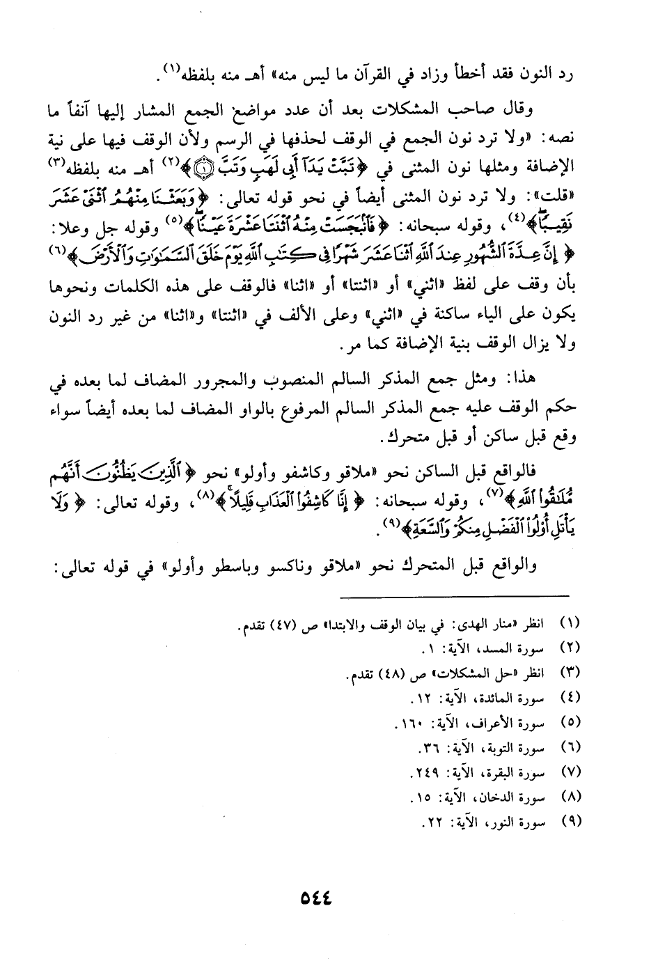 ولأن الوقف فيها على نية الإضافة ومثلها نون المثنى في {تَبَّتْ يَدَآ أَبِي لَهَبٍ وَتَبَّ} [المسد: 1] أهـ منه بلفظه "قلت": ولا ترد نون المثنى أيضاً في نحو قوله تعالى: {وَبَعَثْنَا مِنهُمُ اثني عَشَرَ نَقِيباً} [المائدة: 12] وقوله سبحانه: {فانبجست مِنْهُ اثنتا عَشْرَةَ عَيْناً} [الأعراف: 110] وقوله جل وعلا: {إِنَّ عِدَّةَ الشهور عِندَ الله اثنا عَشَرَ شَهْراً فِي كِتَابِ الله يَوْمَ خَلَقَ السماوات والأرض} [التوبة: 36] بأن وقف على لفظ "اثني" أو "اثنتا" أو "اثنا" فالوقف على هذه الكلمات ونحوها يكون على الياء ساكنة في "اثني" وعلى الألف في "اثنتا" و"اثنا" من غير رد النون ولا يزال الوقف بنية الإضافة كما مر.
