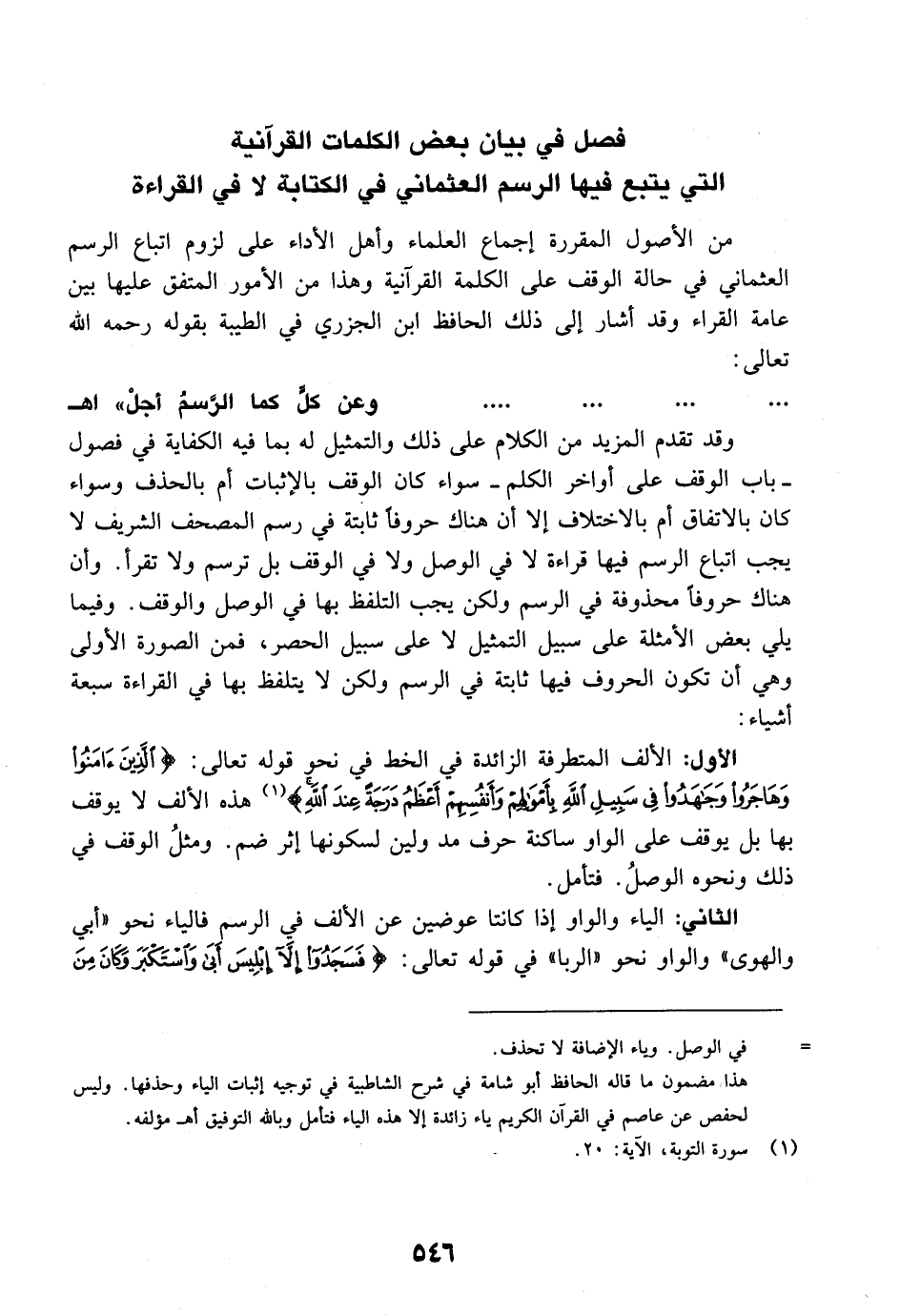 فصل في بيان بعض الكلمات القرآنية التي يتبع فيها الرسم العثماني في الكتابة لا في القراءة.