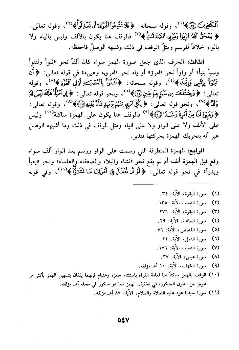 الثالث: الحرف الذي جعل صورة الهمز سواء كان ألفاً نحو "تَبوأ ولتنوأ وسبأ بنبأ" أو واواً نحو "امرؤ" أو ياء نحو "امرئ وهيئ" في قوله تعالى: {أَن تَبُوءَ بِإِثْمِي وَإِثْمِكَ} [المائدة: 29] ، وقوله سبحانه: {لَتَنُوءُ بالعصبة أُوْلِي القوة} [القصص: 76] ، وقوله تعالى: {وَجِئْتُكَ مِن سَبَإٍ بِنَبَإٍ يَقِينٍ} [النمل: 22] ، ونحو قوله تعالى: {إِن امرؤ هَلَكَ لَيْسَ لَهُ وَلَدٌ} [النساء: 176] ، ونحو قوله تعالى: {لِكُلِّ امرىء مِّنْهُمْ يَوْمَئِذٍ شَأْنٌ يُغْنِيهِ} [عبس: 37] ، وقوله تعالى: {وَهَيِّىءْ لَنَا مِنْ أَمْرِنَا رَشَداً} [الكهف: 10] فالوقف هنا يكون على الهمزة ساكنة وليس على الألف ولا على الواو ولا على الياء ومثل الوقف في ذلك وما أشبهه الوصل غير أنه بتحريك الهمزة بحركتها فتدبر.