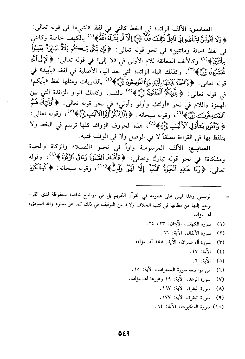 السادس: الألف الزائدة في الخط كالتي في لفظ "لشيء" في قوله تعالى: {وَلاَ تَقْولَنَّ لِشَيْءٍ إِنِّي فَاعِلٌ ذلك غَداً * إِلاَّ أَن يَشَآءَ الله} [الآيتان: 23، 24] بالكهف خاصة وكالتي في لفظ "مائة ومائتين" في نحو قوله تعالى: {فَإِن يَكُنْ مِّنكُمْ مِّائَةٌ صَابِرَةٌ يَغْلِبُواْ مِائَتَيْنِ} [الأنفال: 66] وكالألف المعانقة للام الأولى في "لا إلى" في قوله تعالى: {لإِلَى الله تُحْشَرُونَ} [آل عمران: 158] ، وكذلك الياء الزائدة التي بعد الياء الأصلية في لفظ "بأييد" في قوله تعالى: {والسمآء بَنَيْنَاهَا بِأَييْدٍ وَإِنَّا لَمُوسِعُونَ} [الآية: 47] بالذاريات ومثلها لفظ "بأيكم" في قوله تعالى: {بِأَيِّكُمُ المفتون} [الآية: 6] بالقلم. وكذلك الواو الزائدة التي بين الهمزة واللام في نحو "أولئك وأولو وأولي" في نحو قوله تعالى: {أولائك هُمُ الصادقون} [الحجرات: 15] ، وقوله سبحانه: {إِنَّمَا يَتَذَكَّرُ أُوْلُواْ الألباب} [الرعد: 19] ، وقوله تعالى: {واتقون يا أولي الألباب} [البقرة: 197] ، هذه الحروف الزوائد كلها ترسم في الخط ولا يتلفظ بها في القراءة مطلقاً لا في الوصل ولا في الوقف فتنبه.
