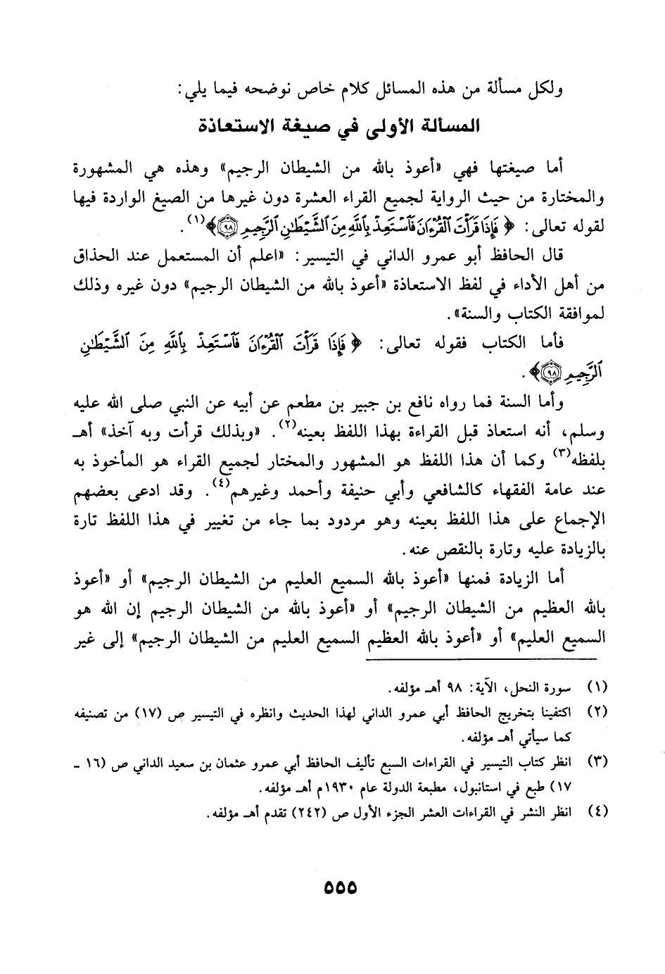 وأما السنة فما رواه نافع بن جبير بن مطعم عن أبيه عن النبي صَلَّى اللَّهُ عَلَيْهِ وَسَلَّمَ، أنه استعاذ قبل القراءة بهذا اللفظ بعينه. "وبذلك قرأت وبه آخذ" أهـ بلفظه وكما أن هذا اللفظ هو المشهور والمختار لجميع القراء هو المأخوذ به عند عامة الفقهاء كالشافعي وأبي حنيفة وأحمد وغيرهم. وقد ادعى بعضهم الإجماع على هذا اللفظ بعينه وهو مردود بما جاء من تغيير في هذا اللفظ تارة بالزيادة عليه وتارة بالنقص عنه.
