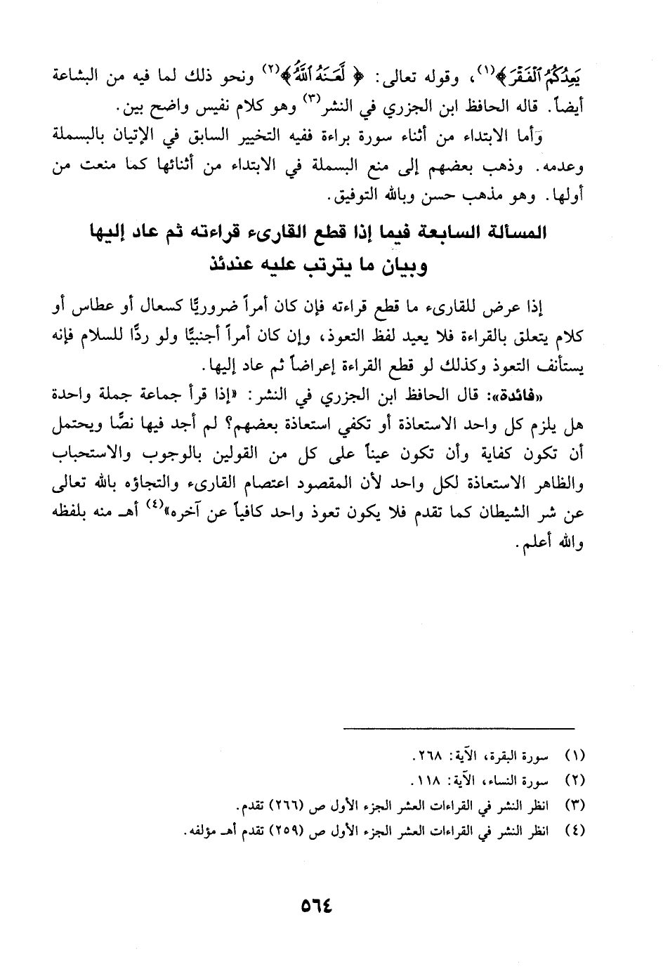 "فائدة": قال الحافظ ابن الجزري في النشر: "إذا قرأ جماعة جملة واحدة هل يلزم كل واحد الاستعاذة أو تكفي استعاذة بعضهم؟ لم أجد فيها نصًّا ويحتمل أن تكون كفاية وأن تكون عيناً على كل من القولين بالوجوب والاستحباب والظاهر الاستعاذة لكل واحد لأن المقصود اعتصام القارئ والتجاؤه بالله تعالى عن شر الشيطان كما تقدم فلا يكون تعوذ واحد كافياً عن آخره" أهـ منه بلفظه والله أعلم.