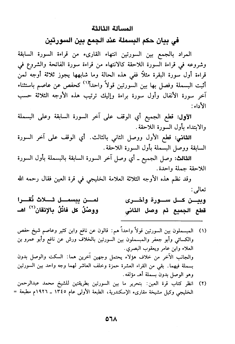 المسألة الثالثة في بيان حكم البسملة عند الجمع بين السورتين