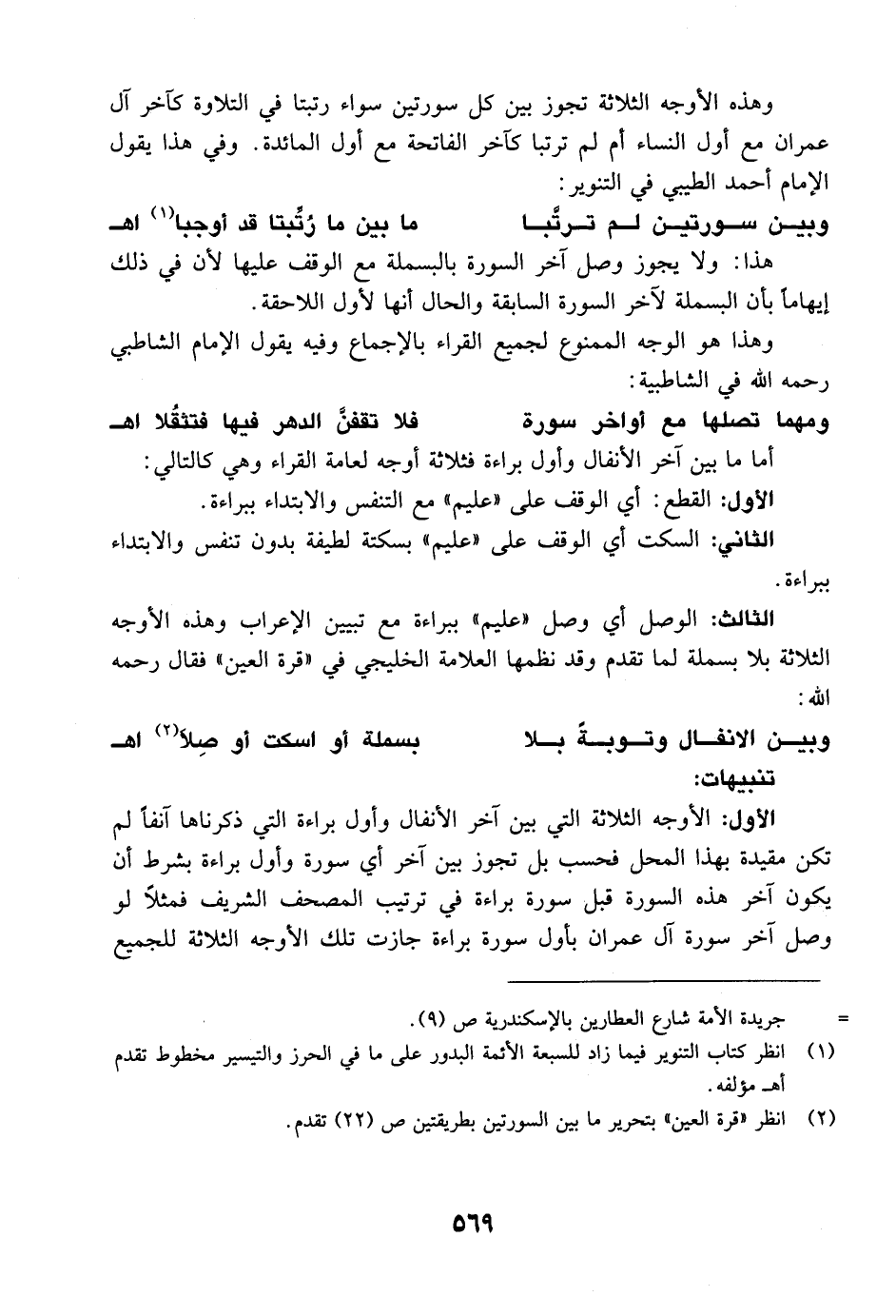 الثالث: الوصل أي وصل "عليم" ببراءة مع تبيين الإعراب وهذه الأوجه الثلاثة بلا بسملة لما تقدم وقد نظمها العلامة الخليجي في "قرة العين" فقال رحمه الله: