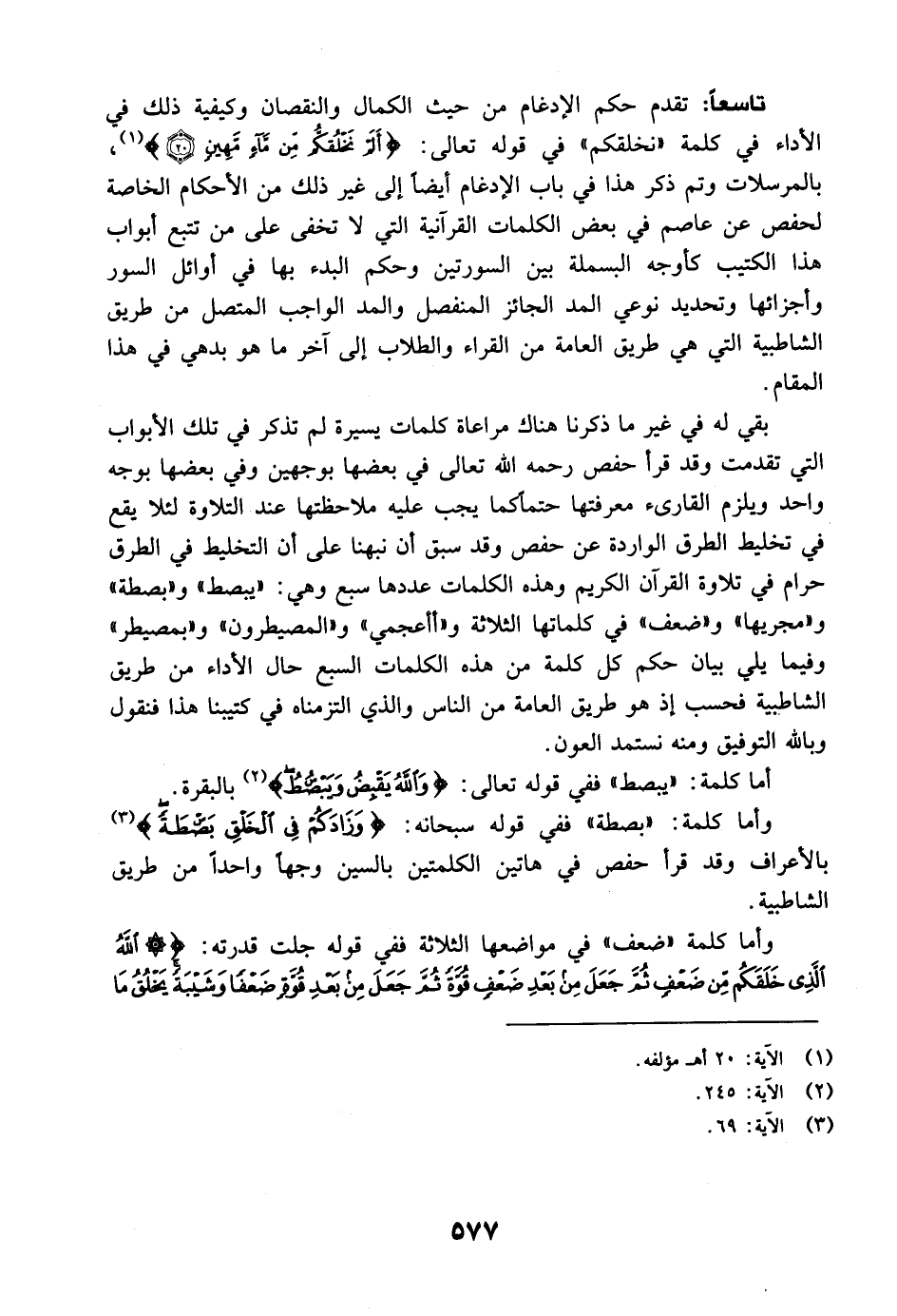 تاسعاً: تقدم حكم الإدغام من حيث الكمال والنقصان وكيفية ذلك في الأداء في كلمة "نخلقكم" في قوله تعالى: {أَلَمْ نَخْلُقكُّم مِّن مَّآءٍ مَّهِينٍ} [الآية: 20] ، بالمرسلات وتم ذكر هذا في باب الإدغام أيضاً إلى غير ذلك من الأحكام الخاصة لحفص عن عاصم في بعض الكلمات القرآنية التي لا تخفى على من تتبع أبواب هذا الكتيب كأوجه البسملة بين السورتين وحكم البدء بها في أوائل السور وأجزائها وتحديد نوعي المد الجائز المنفصل والمد الواجب المتصل من طريق الشاطبية التي هي طريق العامة من القراء والطلاب إلى آخر ماهو بدهي في هذا المقام.