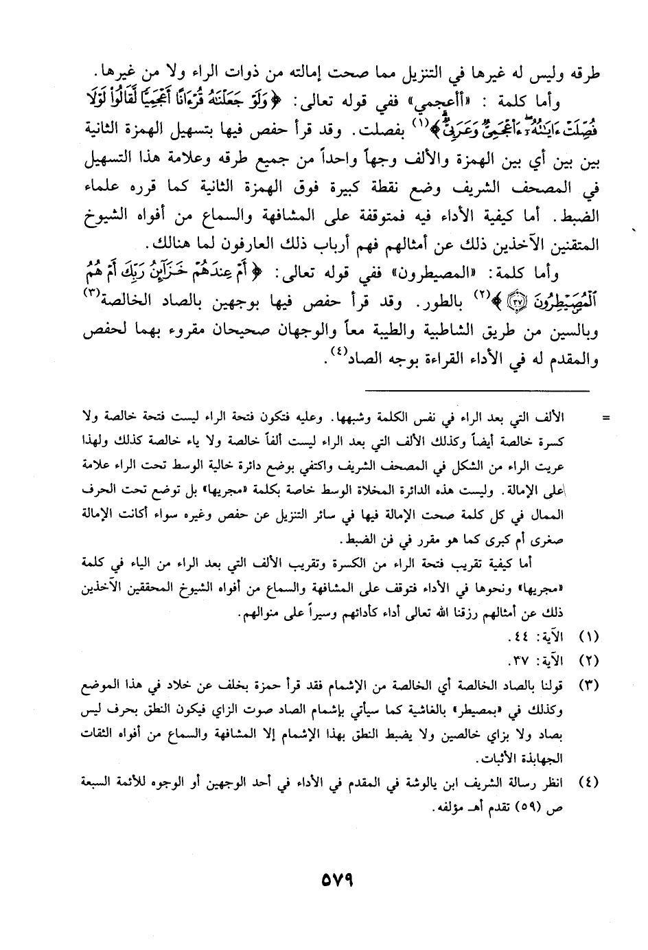 وأما كلمة: "أأعجمي" ففي قوله تعالى: {وَلَوْ جَعَلْنَاهُ قُرْآناً أعْجَمِيّاً لَّقَالُواْ لَوْلاَ فُصِّلَتْ آيَاتُهُءَاعْجَمِيٌّ وَعَرَبِيٌّ} [الآية: 44] بفصلت. وقد قرأ حفص فيها بتسهيل الهمزة الثانية بين بين أي بين الهمزة والألف وجهاً واحداً من جميع طرقه وعلامة هذا التسهيل في المصحف الشريف وضع نقطة كبيرة في الهمزة الثانية كما قرره علماء الضبط. أما كيفية الأداء فيه فمتوقفة على المشافهة والسماع من أفواه الشيوخ المتقنين الآخذين ذلك عن أمثالهم فهم أرباب ذلك العارفون لما هنالك.