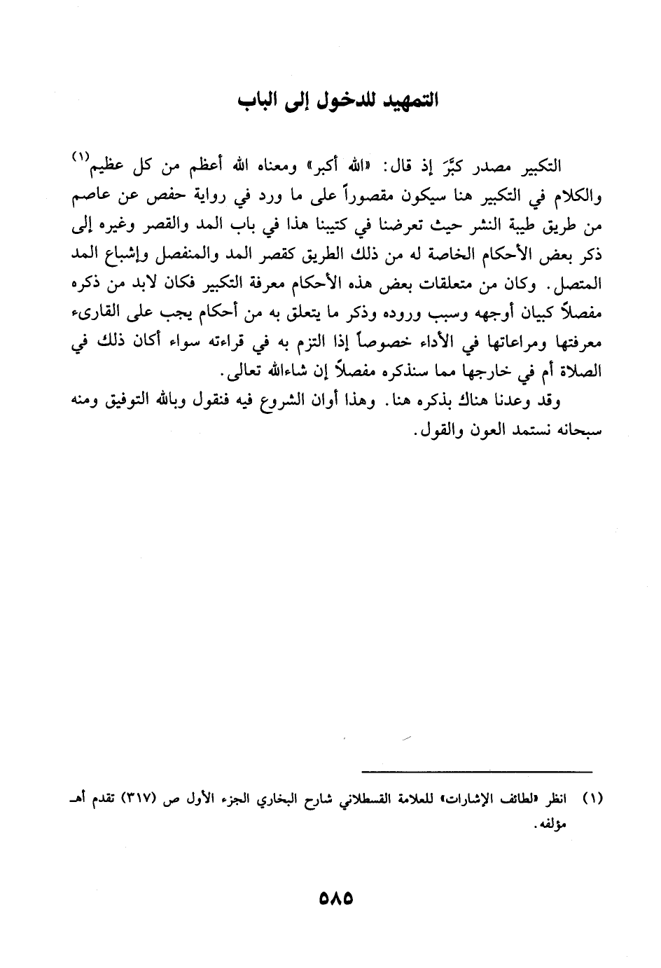التكبير مصدر كبَّرَ إذ قال: "الله أكبر" ومعناه الله أعظم من كل عظيم والكلام في التكبير هنا سيكون مقصوراً على ما ورد في رواية حفص عن عاصم من طريق طيبة النشر حيث تعرضنا في كتيبنا هذا في باب المد والقصر وغيره إلى ذكر بعض الأحكام الخاصة له من ذلك الطريق كقصر المد والمنفصل وإشباع المد المتصل. وكان من متعلقات بعض هذه الأحكام معرفة التكبير فكان لابد من ذكره مفصلاً كبيان أوجهه وسبب وروده وذكر ما يتعلق به من أحكام يجب على القارئ معرفتها ومراعاتها في الأداء خصوصاً إذا التزم به في قراءته سواء أكان ذلك في الصلاة أم في خارجها مما سنذكره مفصلاً إن شاء الله تعالى.