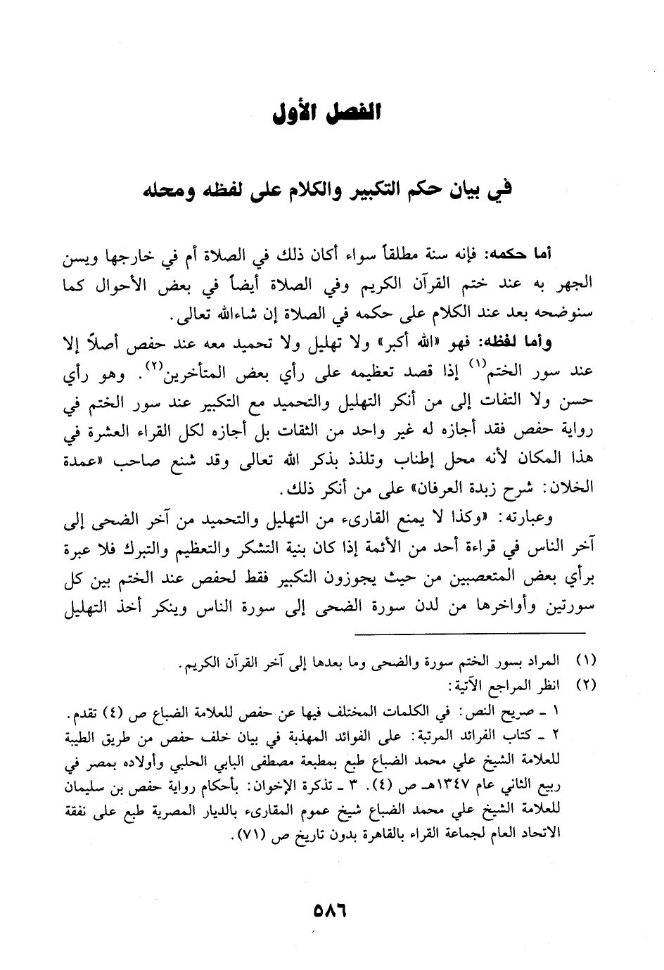 وعبارته: "وكذا لا يمنع القارئ من التهليل والتحميد من آخر الضحى إلى آخر الناس في قراءة أحد من الأئمة إذا كان بنية التشكر والتعظيم والتبرك فلا عبرة برأي بعض المتعصبين من حيث يجوزون التكبير فقط لحفص عن الختم بين كل سورتين وأواخرها من لدن سورة الضحى إلى سورة الناس وينكر أخذ التهليل