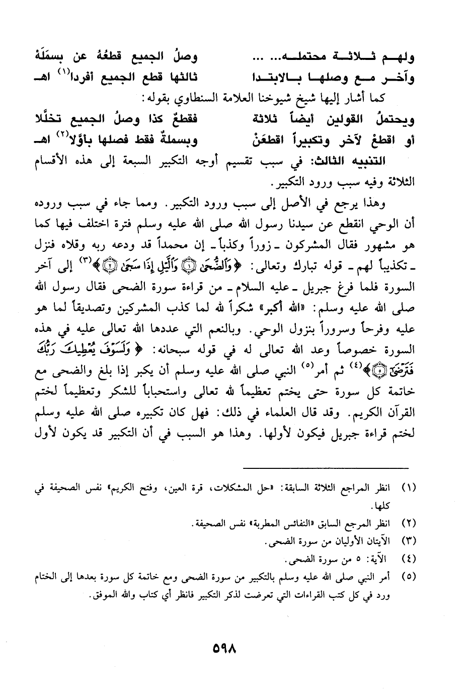وهذا يرجع في الأصل إلى سبب ورود التكبير. ومما جاء في سبب وروده أن الوحي انقطع عن سيدنا رسول الله صَلَّى اللَّهُ عَلَيْهِ وَسَلَّمَ فترة اختلف فيها كما هو مشهور فقال المشركون -زوراً وكذباً- إن محمداً قد ودعه ربه وقلاه فنزل - تكذيباً لهم - قوله تبارك وتعالى: {والضحى * والليل إِذَا سجى} [الضحى: 1، 2] إلى آخر السورة فلما فرغ جبريل - عليه السلام - من قراءة سورة الضحى فقال رسول الله صَلَّى اللَّهُ عَلَيْهِ وَسَلَّمَ: "الله أكبر" شكراً لله لما كذب المشركين وتصديقاً لما هو عليه وفرحاً وسروراً بنزول الوحي. وبالنعم التي عددها الله تعالى عليه في هذه السورة خصوصاً وعد الله تعالى له في قوله سبحانه: {وَلَسَوْفَ يُعْطِيكَ رَبُّكَ فترضى} [الضحى: 5] ثم أمر النبي صَلَّى اللَّهُ عَلَيْهِ وَسَلَّمَ أن يكبر إذا بلغ والضحى مع خاتمة كل سورة حتى يختم تعظيماً لله تعالى واستحباباً للشكر وتعظيماً لختم القرآن الكريم. وقد قال العلماء في ذلك: فهل كان تكبيره صَلَّى اللَّهُ عَلَيْهِ وَسَلَّمَ لختم قراءة جبريل فيكون لأولها. وهذا هو السبب في أن التكبير قد يكون لأول