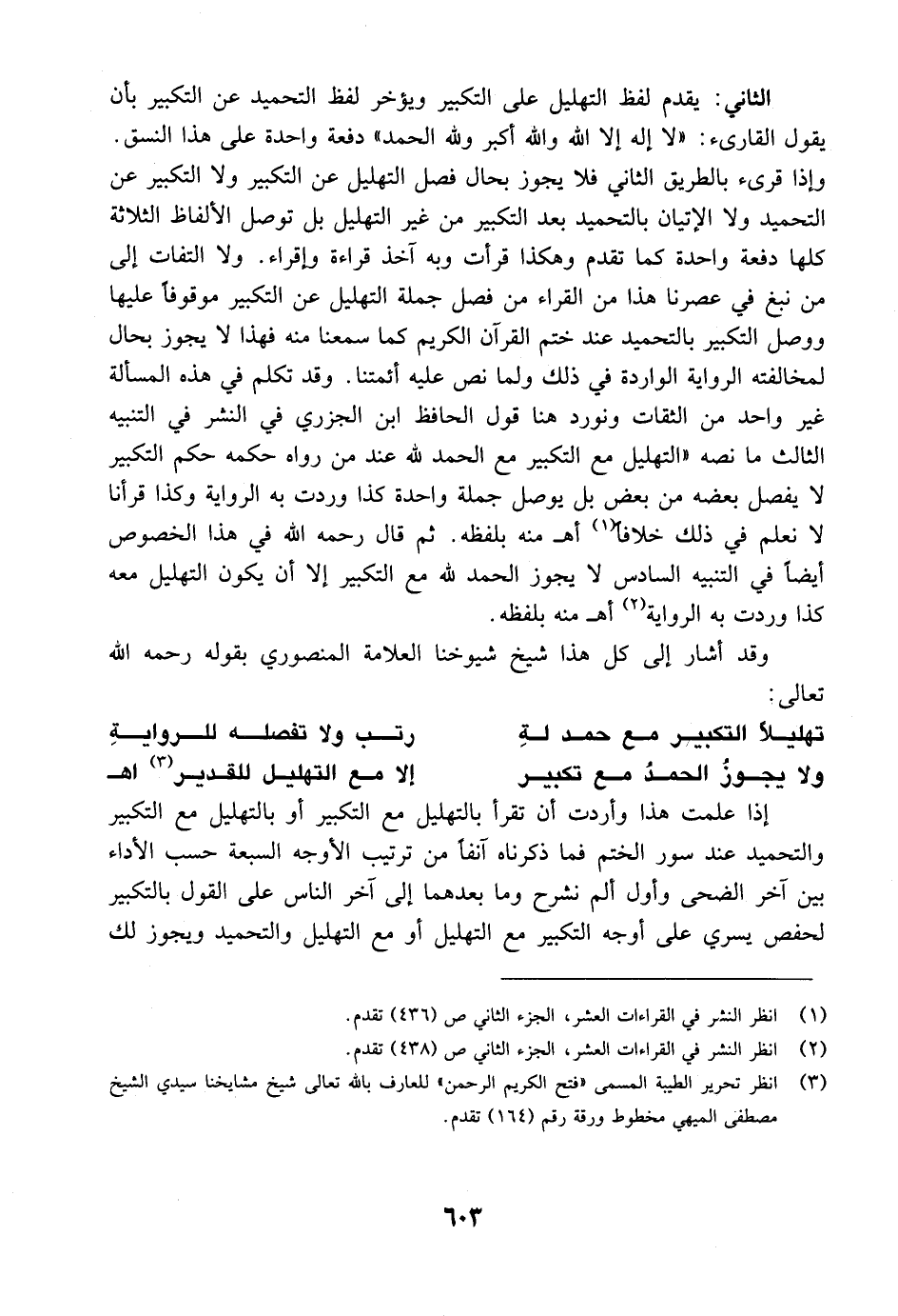 الثاني: يقدم لفظ التهليل على التكبير ويؤخر لفظ التحميد عن التكبير بأن يقول القارئ: "لا إله إلا الله والله أكبر ولله الحمد" دفعة واحدة على هذا النسق. وإذا قرئ بالطريق الثاني فلا يجوز بحال فصل التهليل عن التكبير ولا التكبير عن التحميد ولا الإتيان بالتحميد بعد التكبير من غير التهليل بل توصل الألفاظ الثلاثة كلها دفعة واحدة كما تقدم وهكذا قرأت وبه آخذ قراءة وإقراء. ولا التفات إلى من نبغ في عصرنا هذا من القراء من فصل جملة التهليل عن التكبير موقوفاً عليها ووصل التكبير بالتحميد عند ختم القرآن الكريم كما سمعنا منه فهذا لا يجوز بحال لمخالفته الرواية الواردة في ذلك ولما نص عليه أئمتنا. وقد تكلم في هذه المسألة غير واحد من الثقات ونورد هنا قول الحافظ ابن الجزري في النشر في التنبيه الثالث ما نصه "التهليل مع التكبير مع الحمد لله عند من رواه حكمه حكم التكبير لا يفصل بعضه من بعض بل يوصل جملة واحدة كذا وردت به الرواية وكذا قرأنا لا نعلم في ذلك خلافاً أهـ منه بلفظه. ثم قال رحمه الله في هذا الخصوص أيضاً في التنبيه السادس لا يجوز الحمد لله مع التكبير إلا أن يكون التهليل معه كذا وردت به الرواية أهـ منه بلفظه.