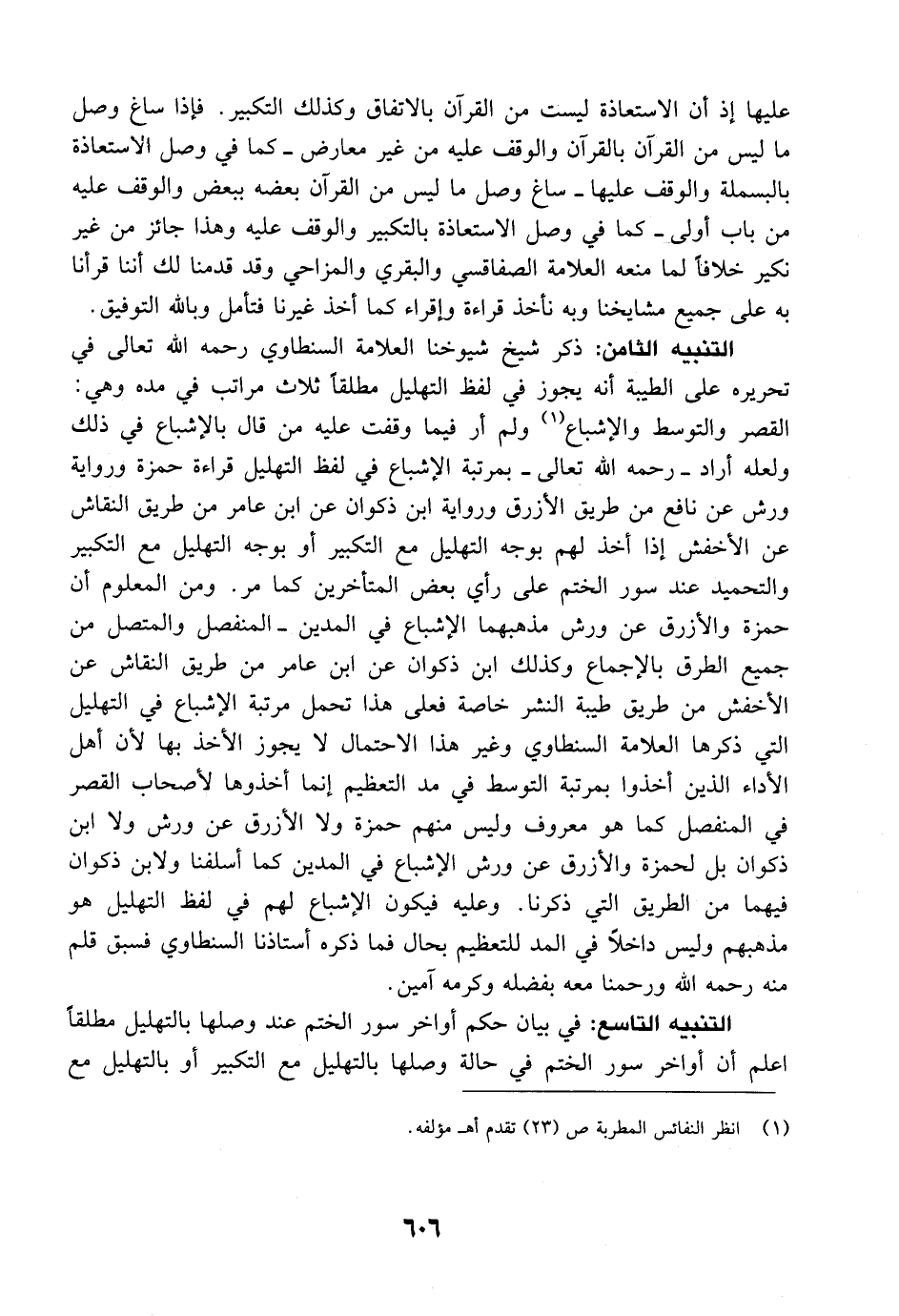 التنبيه الثامن: ذكر شيخ شيوخنا العلامة السنطاوي رحمه الله تعالى في تحريره على الطيبة أنه يجوز في لفظ التهليل مطلقاً ثلاث مراتب في مده وهي: القصر والتوسط والإشباع ولم أر فيما وقفت عليه من قال بالإشباع في ذلك ولعله أراد - رحمه الله تعالى - بمرتبة الإشباع في لفظ التهليل قراءة حمزة ورواية ورش عن نافع من طريق الأزرق ورواية ابن ذكوان عن ابن عامر من طريق النقاش عن الأخفش إذا أخذ لهم بوجه التهليل مع التكبير أو بوجه التهليل مع التكبير والتحميد عند سور الختم على رأي بعض المتأخرين كما مر. ومن المعلوم أن حمزة والأزرق عن ورش مذهبهما الإشباع في المدين - المنفصل والمتصل من جميع الطرق بالإجماع وكذلك ابن ذكوان عن ابن عامر من طريق النقاش عن الأخفش من طريق طيبة النشر خاصة فعلى هذا تحمل مرتبة الإشباع في التهليل التي ذكرها العلامة السنطاوي وغير هذا الاحتمال لا يجوز الأخذ بها لأن أهل الأداء الذين أخذوا بمرتبة التوسط في مد التعظيم إنما إخذوها لأصحاب القصر في المنفصل كما هو معروف وليس مهم حمزة ولا الأرزق عن ورش ولا ابن ذكوان بل لحمزة والأزرق عن ورش الإشباع في المدين كما أسلفنا ولابن ذكوان فيهما من الطريق التي ذكرنا. وعليه فيكون الإشباع لهم في لفظ التهليل هو مذهبهم وليس داخلاً في المد للتعظيم بحال فما ذكره أستاذنا السنطاوي فسبق قلم منه رحمه الله ورحمنا معه بفضله وكرمه آمين.