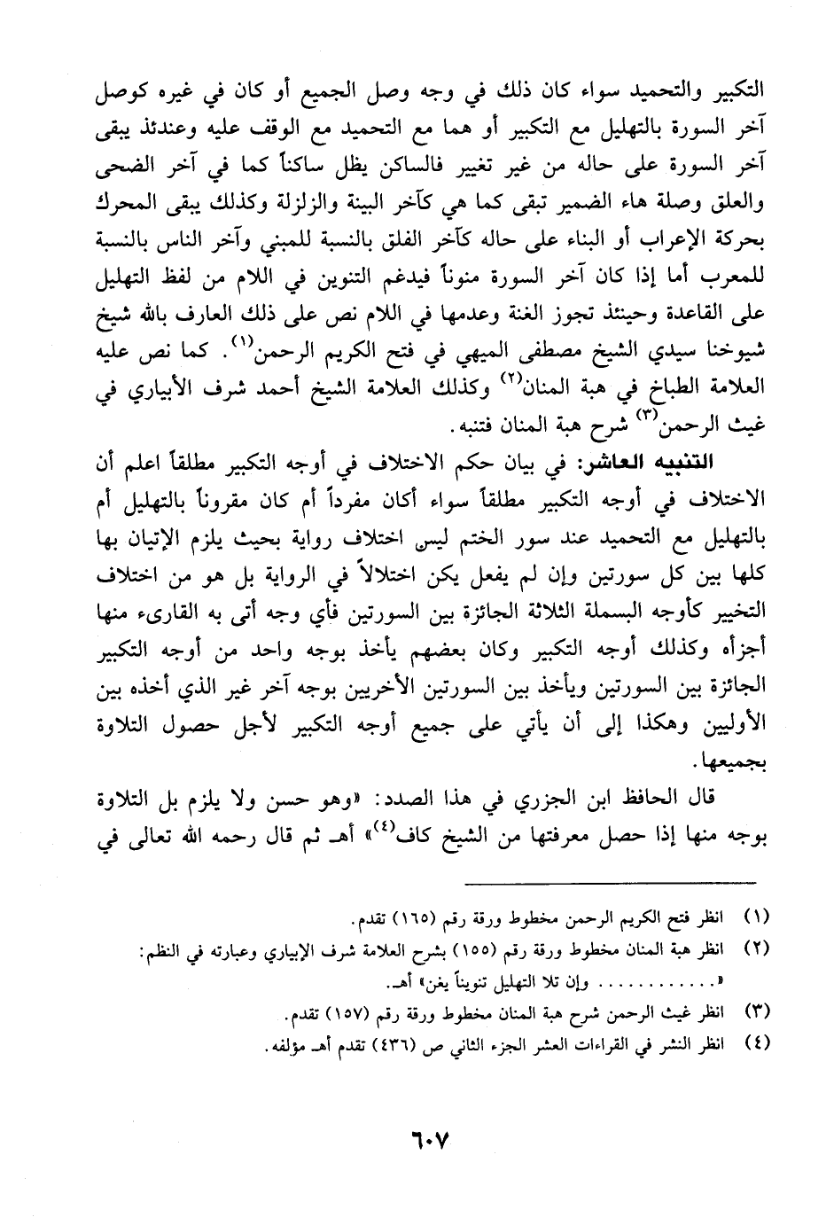 التنبيه العاشر: في بيان حكم الاختلاف في أوجه التكبير مطلقاً اعلم أن الاختلاف في أوجه التكبير مطلقاً سواء أكان مفرداً أم كان مقروناً بالتهليل أم بالتهليل مع التحميد عند سور الختم ليس اختلاف رواية بحيث يلزم الإتيان بها كلها بين كل سورتين وإن لم يفعل يكن اختلالاً في الرواية بل هو من اختلاف التخيير كأوجه البسملة الثلاثة الجائزة بين السورتين فأي وجه أتى به القارئ منها أجزأه وكذلك أوجه التكبير وكان بعضهم يأخذ بوجه واحد من أوجه التكبير الجائزة بين السورتين ويأخذ بين السورتين الأخريين بوجه آخر غير الذي أخذه بين الأوليين وهكذا إلى أن يأتي على جميع أوجه التكبير لأجل حصول التلاوة بجميعها.