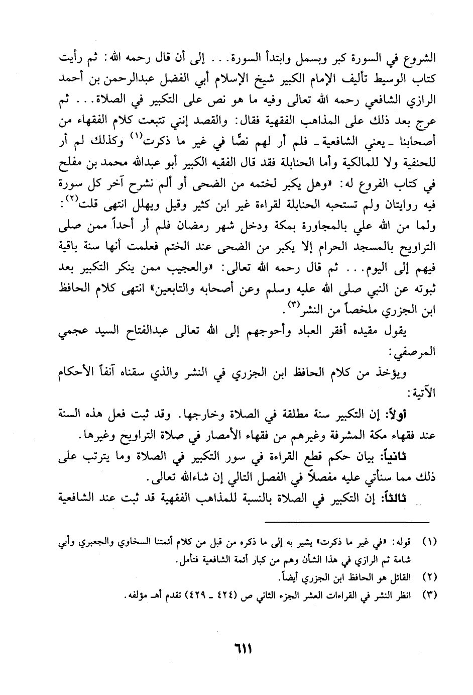 الشروع في السورة كبر وبسمل وابتدأ السورة ... إلى أن قال رحمه الله: ثم رأيت كتاب الوسيط تأليف الإمام الكبير شيخ الإسلام أبي الفضل عبد الرحمن بن أحمد الرازي الشافعي رحمه الله تعالى وفيه ما هو نص على التكبير في الصلاة ... ثم عرج بعد ذلك على المذاهب الفقهية فقال: والقصد إنني تتبعت كلام الفقهاء من أصحابنا - يعني الشافعية - فلم أر لهم نصًّا في غير ما ذكرت وكذلك لم أر للحنفية ولا للمالكية وأما الحنابلة فقد قال الفقيه الكبير أبو عبد الله محمد بن مفلح في كتاب الفروع له: "وهل يكبر لختمه من الضحى أو ألم نشرح آخر كل سورة فيه روايتان ولم تستحبه الحنابلة لقراءة غير ابن كثير وقيل ويهلل انتهى قلت: ولما من الله علي بالمجاورة بمكة ودخل شهر رمضان فلم أر أحداً ممن صلى التراويح بالمسجد الحرام إلا يكبر من الضحى عند الختم فعلمت أنها سنة باقية فيهم إلى اليوم ... ثم قال رحمه الله تعالى: "والعجيب ممن ينكر التكبير بعد ثبوته عن النبي صَلَّى اللَّهُ عَلَيْهِ وَسَلَّمَ وعن أصحابه والتابعين" انتهى كلام الحافظ ابن الجزري ملخصاً من النشر.