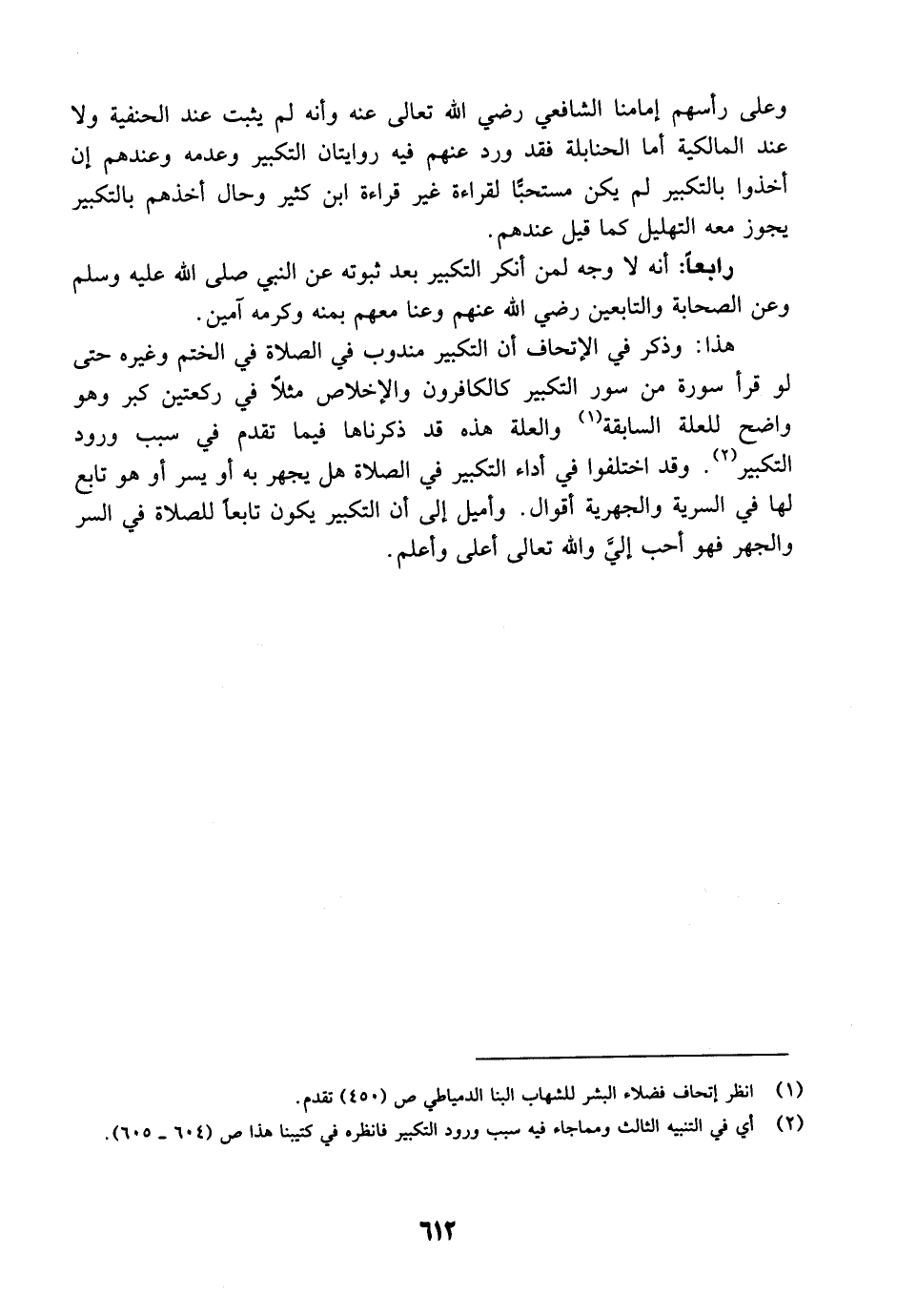 هذا: وذكر في الإتحاف أن التكبير مندوب في الصلاة في الختم وغيره حتى لو قرأ سورة من سور التكبير كالكافرون والإخلاص مثلاً في ركعتين كبر وهو واضح للعلة السابقة والعلة هذه قد ذكرناها فيما تقدم في سبب ورود التكبير. وقد اختلفوا في أداء التكبير في الصلاة هل يجهر به أو يسر أو هو تابع لها في السرية والجهرية أقوال. وأميل إلى أن التكبير يكون تابعاً للصلاة في السر والجهر فهو أحب إليَّ والله تعالى أعلى وأعلم.
