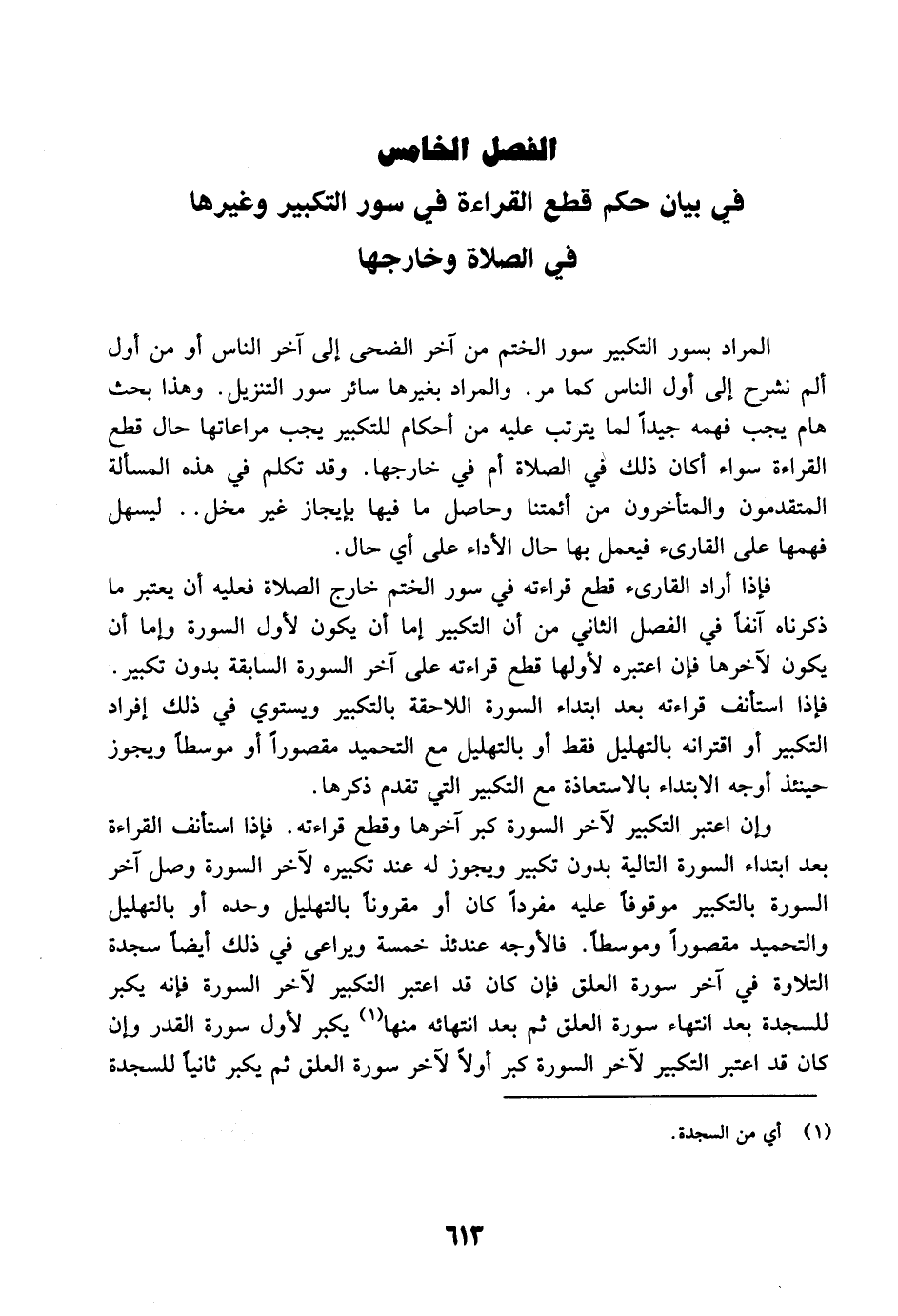 الفصل الخامس: في بيان حكم قطع القراءة في سور التكبير وغيرها في الصلاة وخارجها.