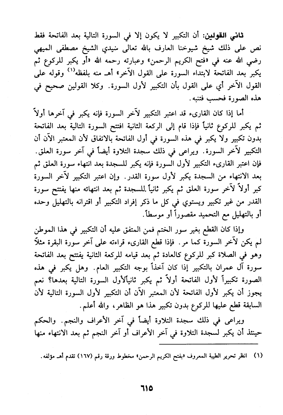 أما إذا كان القارئ قد اعتبر التكبير لآخر السورة فإنه يكبر في آخرها أولاً ثم يكبر للركوع ثانياً فإذا قام إلى الركعة الثانية افتتح السورة التالية بعد الفاتحة بدون تكبير ولا يكبر في هذه السورة في أول الفاتحة بالاتفاق لأن المعتبر الآن أن التكبير لآخر السورة. ويراعى في ذلك سجدة التلاوة أيضاً في آخر سورة العلق. فإن اعتبر القارئ التكبير لأول السورة فإنه يكبر للسجدة بعد انتهاء سورة العلق ثم بعد الانتهاء من السجدة يكبر لأول سورة القدر. وإن اعتبر التكبير لآخر السورة كبر أولاً لآخر سورة العلق ثم يكبر ثانياً للسجدة ثم بعد انتهائه منها يفتتح سورة القدر من غير تكبير ويستوي في كل ما ذكر إفراد التكبير أو اقترانه بالتهليل وحده أو بالتهليل مع التحميد مقصوراً أو موسطاً.