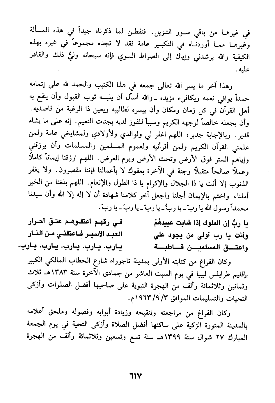 وكان الفراغ من كتابته الأولى بمدينة تاجوراء شارع الحطاب المالكي الكبير بإقليم طرابلس ليبيا في يوم السبت العاشر من جمادى الآخرى سنة 1383هـ ثلاث وثمانين وثلاثمائة وألف من الهجرة النبوية على صاحبها أفضل الصلوات وأزكى التحيات والتسليمات الموافق 3/9/1963م.