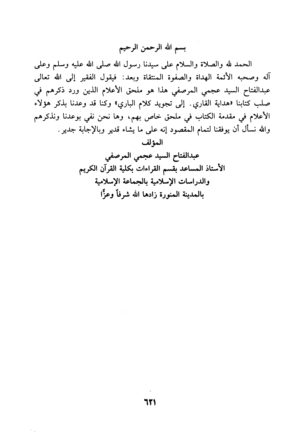 الحمد لله والصلاة والسلام على سيدنا رسول الله صَلَّى اللَّهُ عَلَيْهِ وَسَلَّمَ وعلى آله وصحبه الأئمة الهداة والصفوة المنتقاة وبعد: فيقول الفقير إلى الله تعالى عبد الفتاح السيد عجمي المرصفي هذا هو ملحق الأعلام الذين ورد ذكرهم في صلب كتابنا "هداية القاري. إلى تجويد كلام الباري" وكنا قد وعدنا بذكر هؤلاء الأعلام في مقدمة الكتاب في ملحق خاص بهم، وها نحن نفي بوعدنا ونذكرهم والله نسأل أن يوفقنا لتمام المقصود إنه على ما يشاء قدير وبالإجابة جدير.
