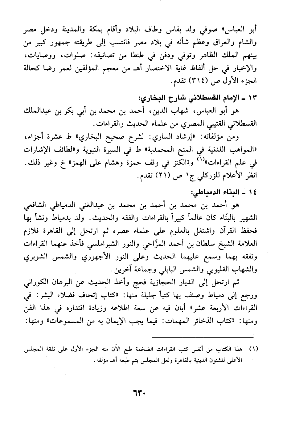 ومن مؤلفاته: "إرشاد الساري: لشرح صحيح البخاري" ط عشرة أجزاء، "المواهب اللدنية في منح المحمدية" ط في السيرة النبوية و "لطائف الإشارات في علم القراءات" و "الكنز في وقف حمزة وهشام على الهمز" خ وغير ذلك. انظر الأعلام للزركلي ج1 ص (21) تقدم.